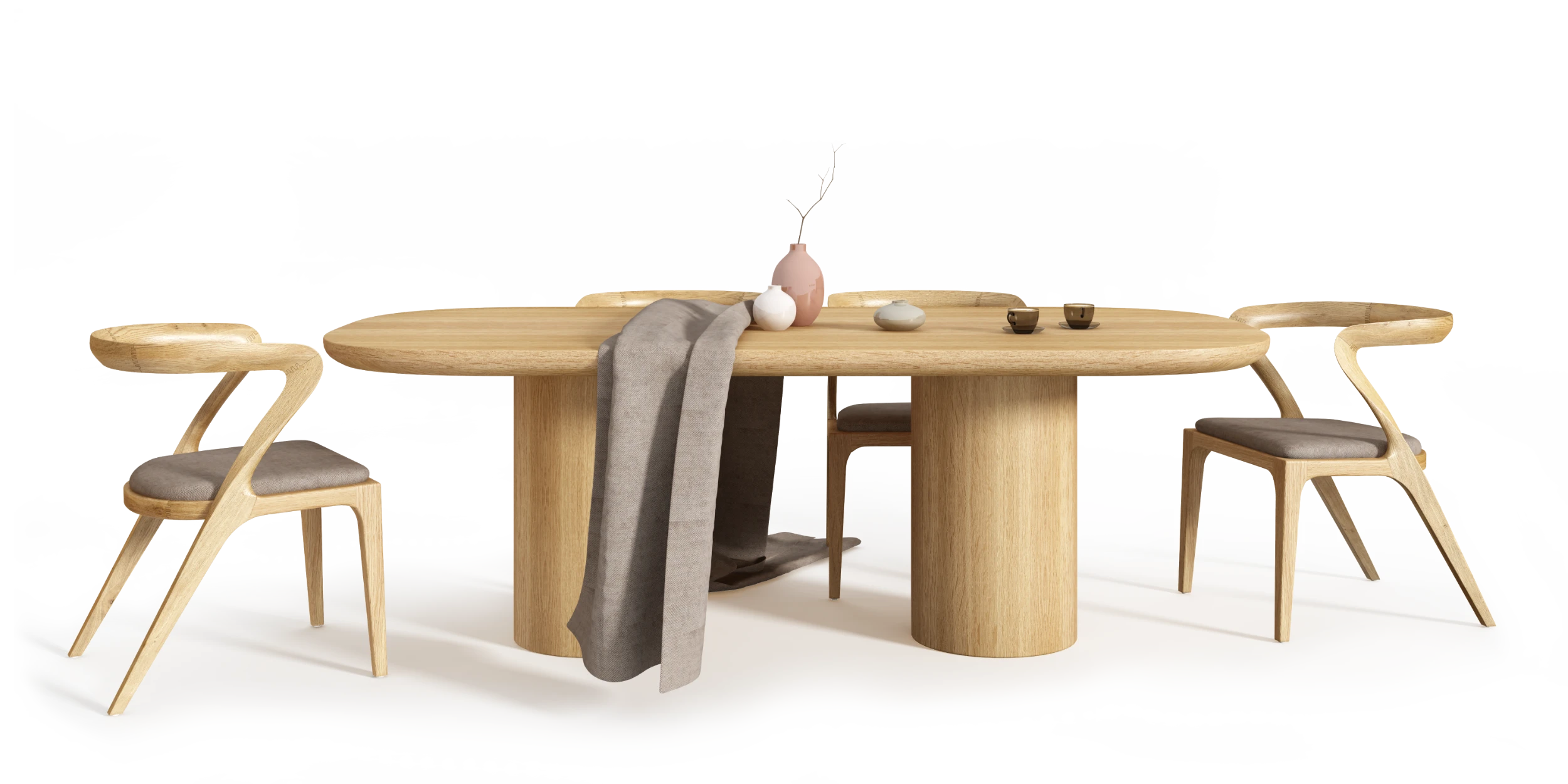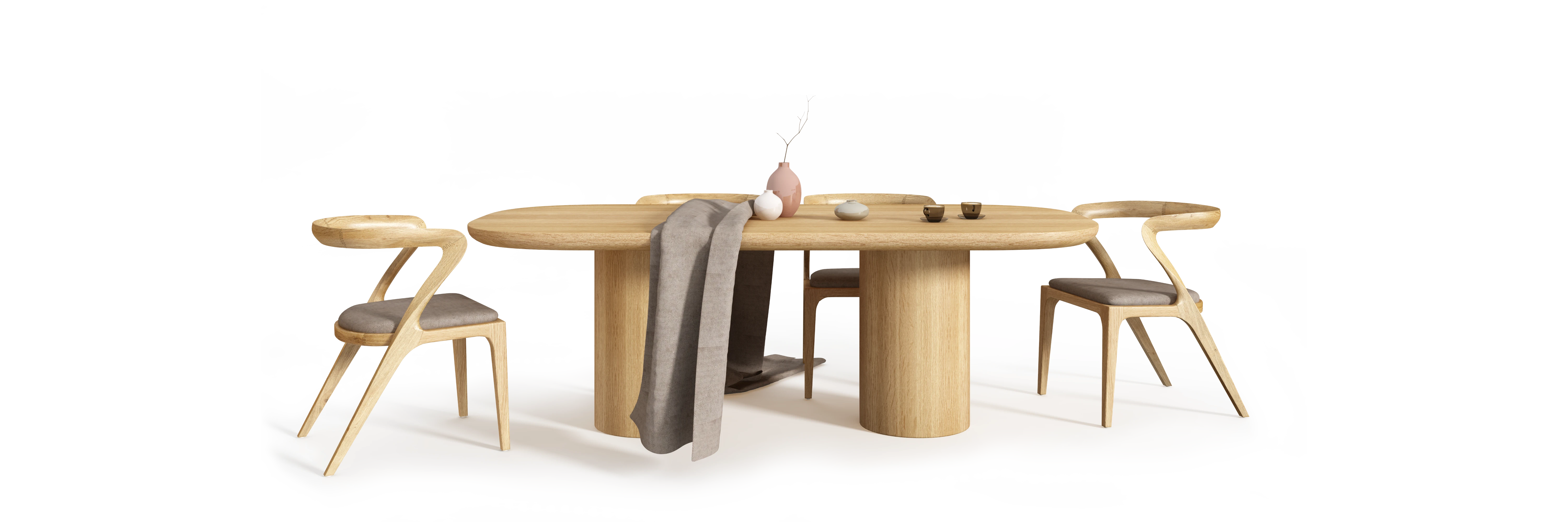 Materiał nie dominuje kompozycji, lecz porządkuje jej odbiór. Ciepły ton drewna podkreśla masę blatu i miękkość jego krawędzi, nie wprowadzając dodatkowych akcentów formalnych.