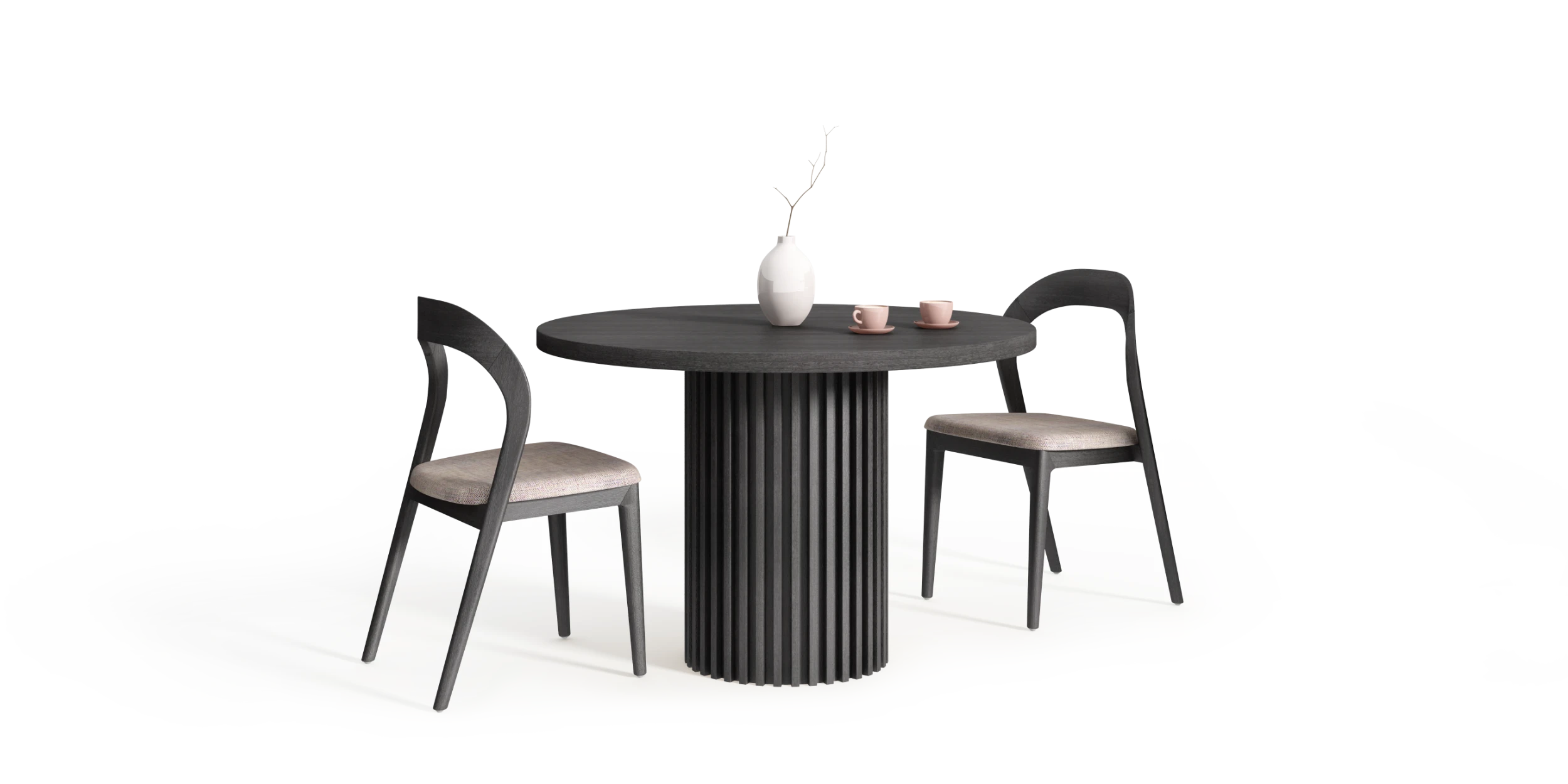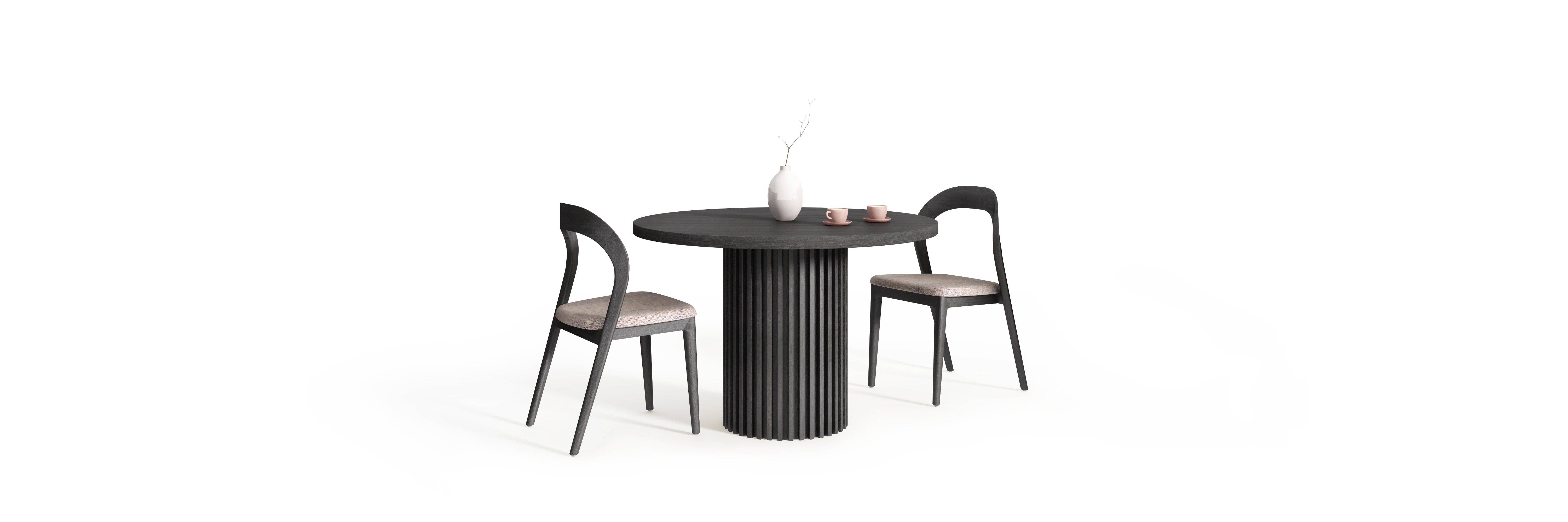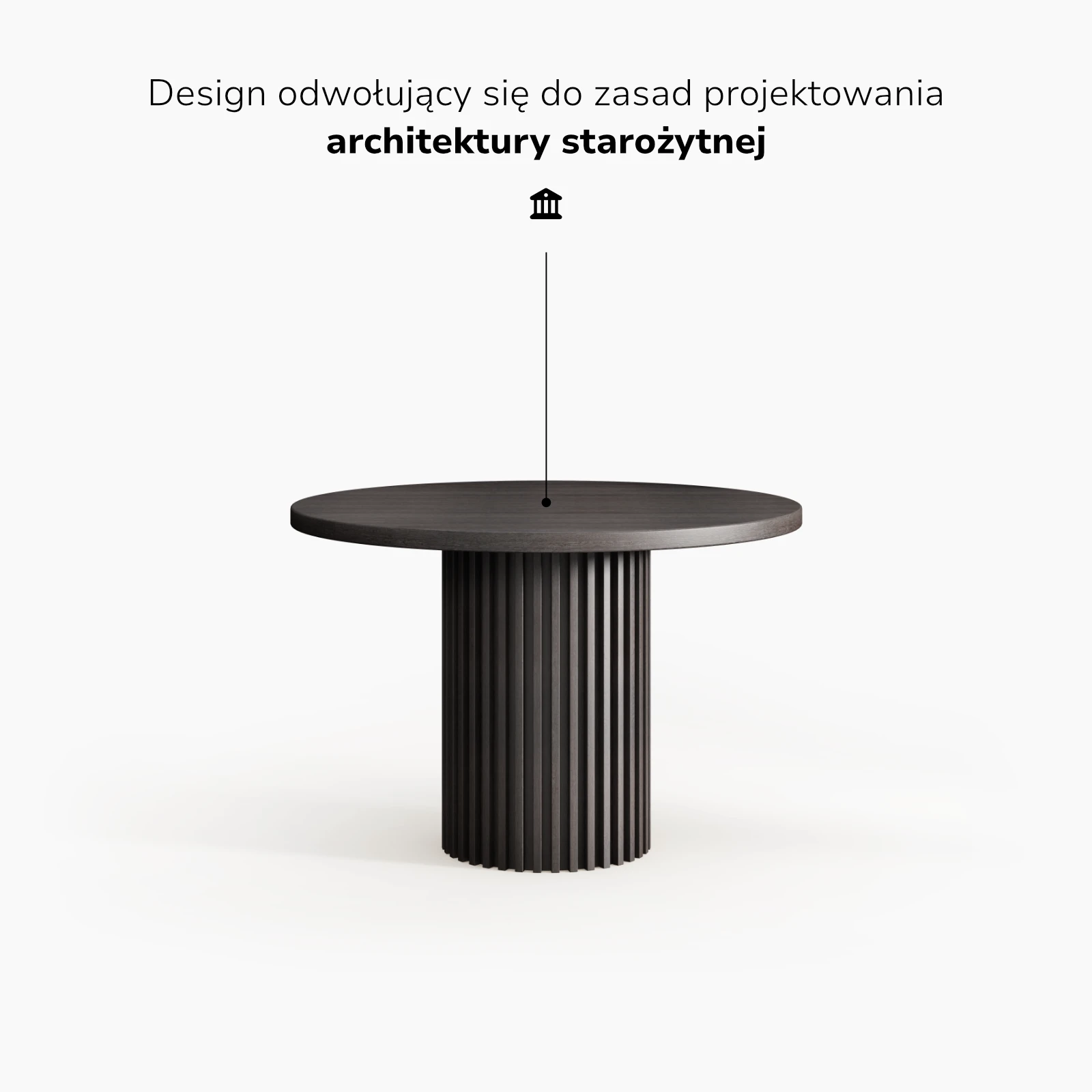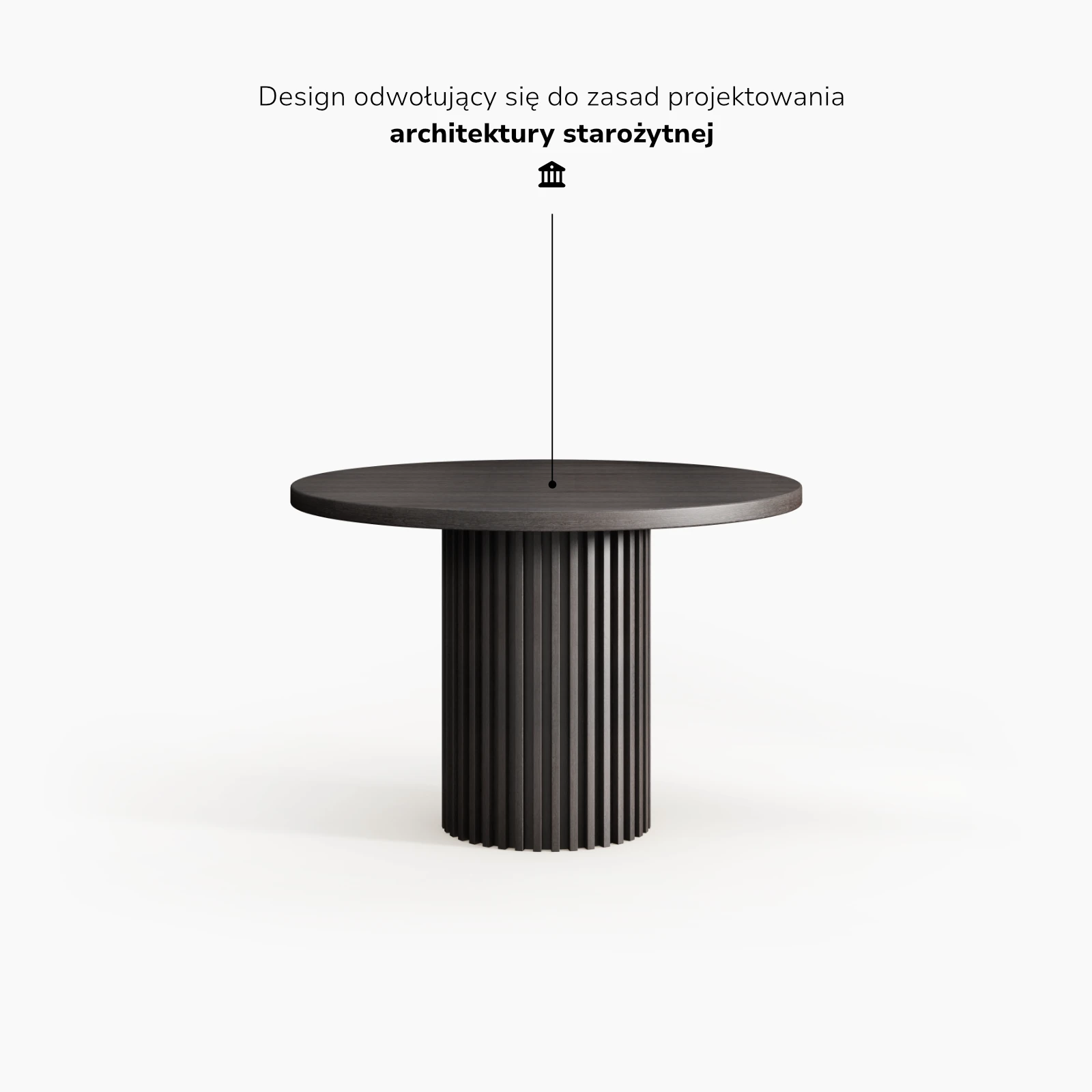 Pojedyncza podstawa pełni funkcję kolumny jako elementu nośnego i organizującego całą kompozycję. Skupienie obciążeń w centralnym punkcie porządkuje relację pomiędzy blatem a podparciem bez wprowadzania dodatkowych struktur bocznych.