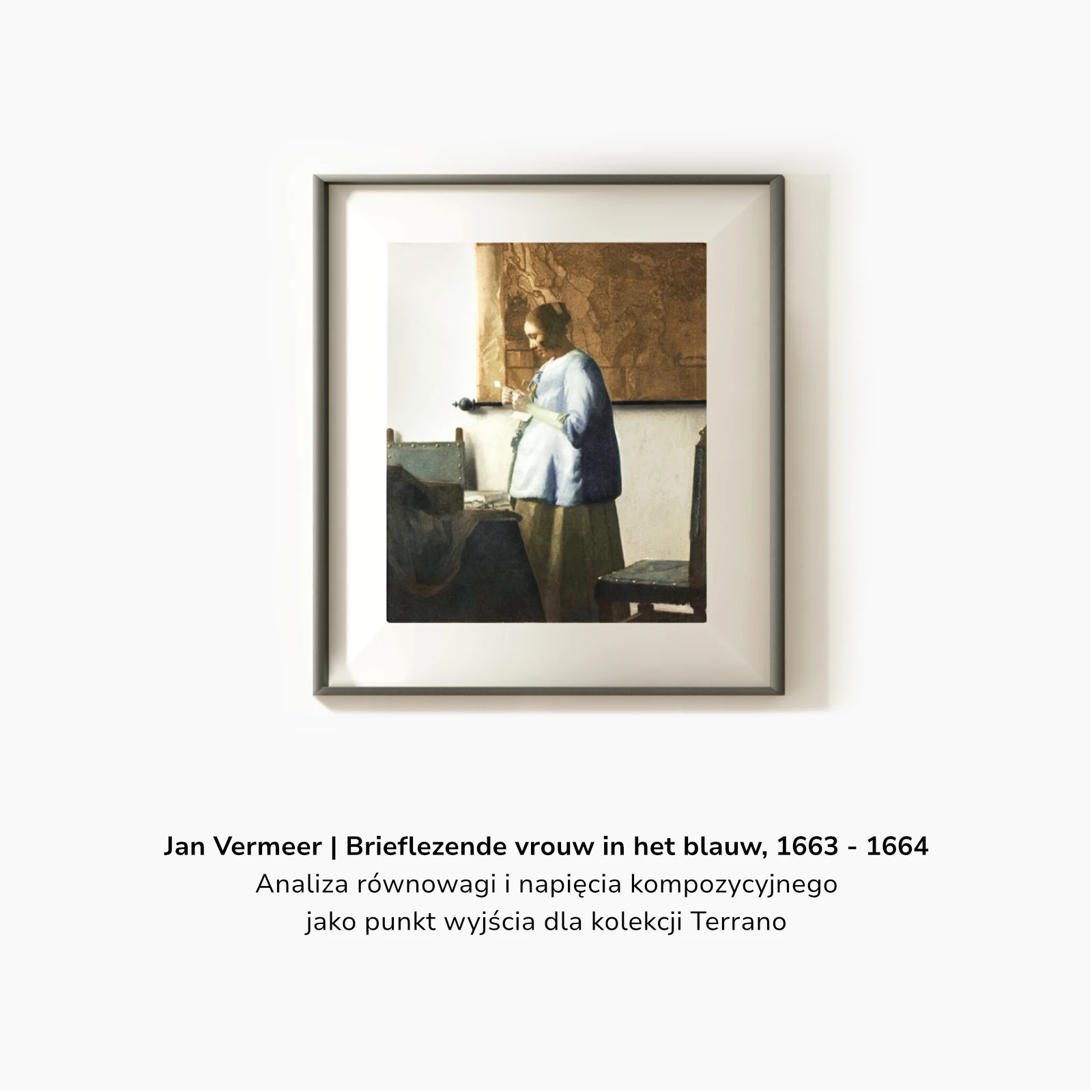 Punktem odniesienia dla kolekcji Terrano jest sposób, w jaki malarstwo Vermeera buduje równowagę poza symetrią. Kompozycja pozostaje stabilna, mimo że jej osie są przesunięte, a ciężar rozłożony nierównomiernie. Porządek nie wynika z regularności, lecz z precyzyjnej kontroli relacji.