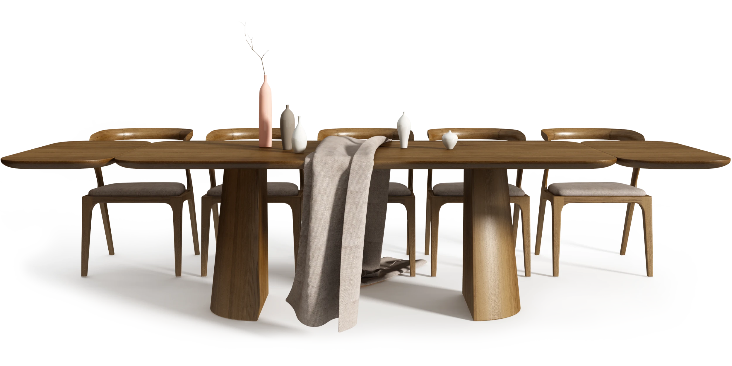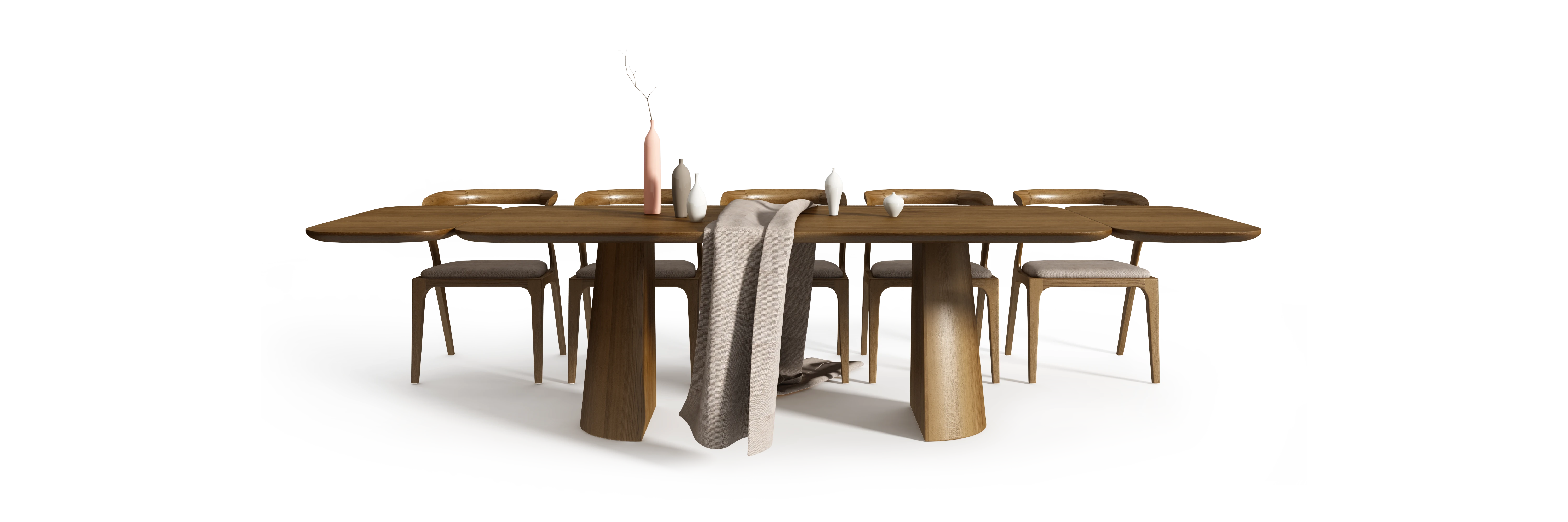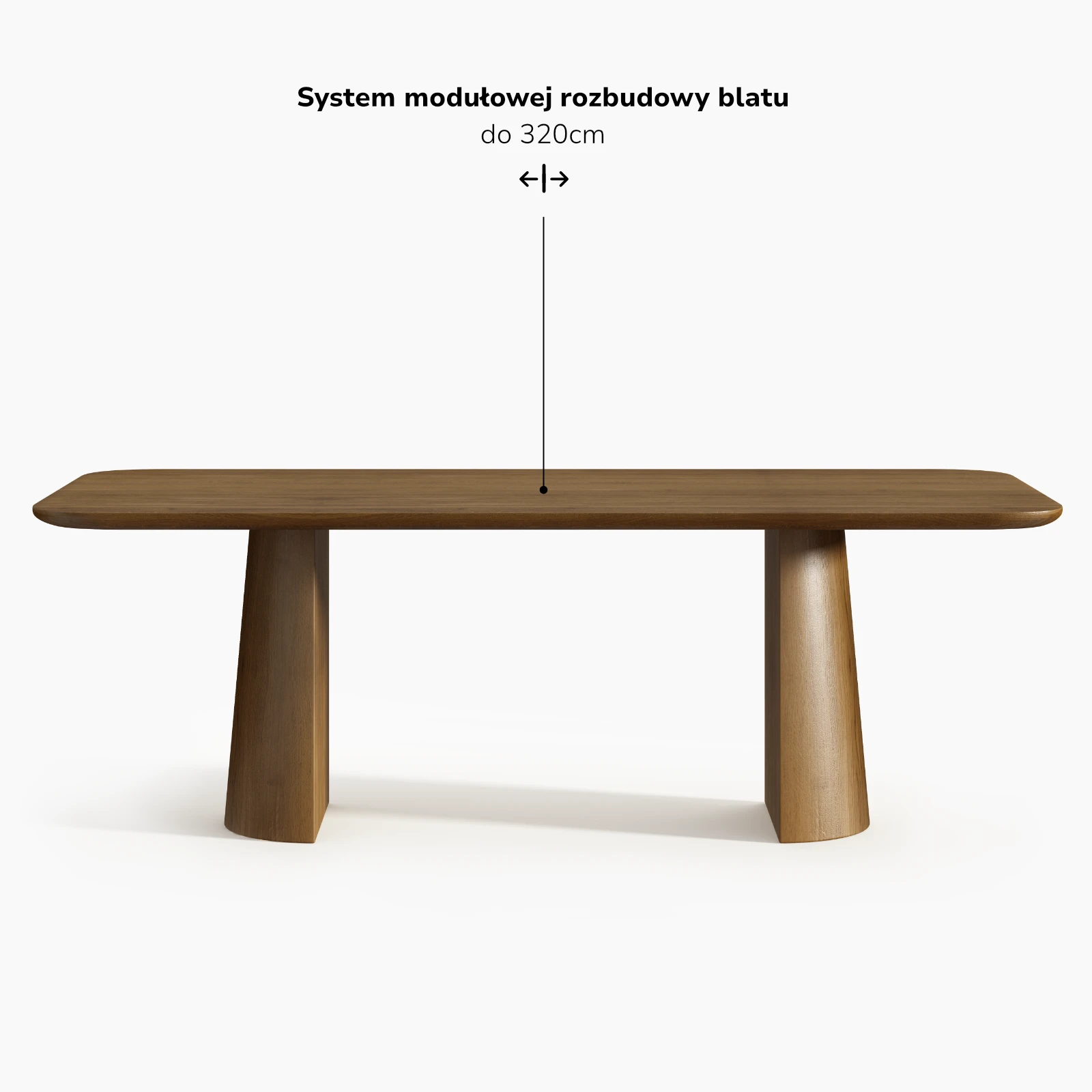 Modułowy blat z drewna dębowego powtarza charakterystyczny przekrój krawędzi oparty na linii łuku. Jego geometria porządkuje relację pomiędzy grubością blatu a lekkością odbioru formy. Konstrukcja stołu zachowuje stabilność i czytelność, bez akcentowania elementów nośnych jako dominanty kompozycyjnej.
