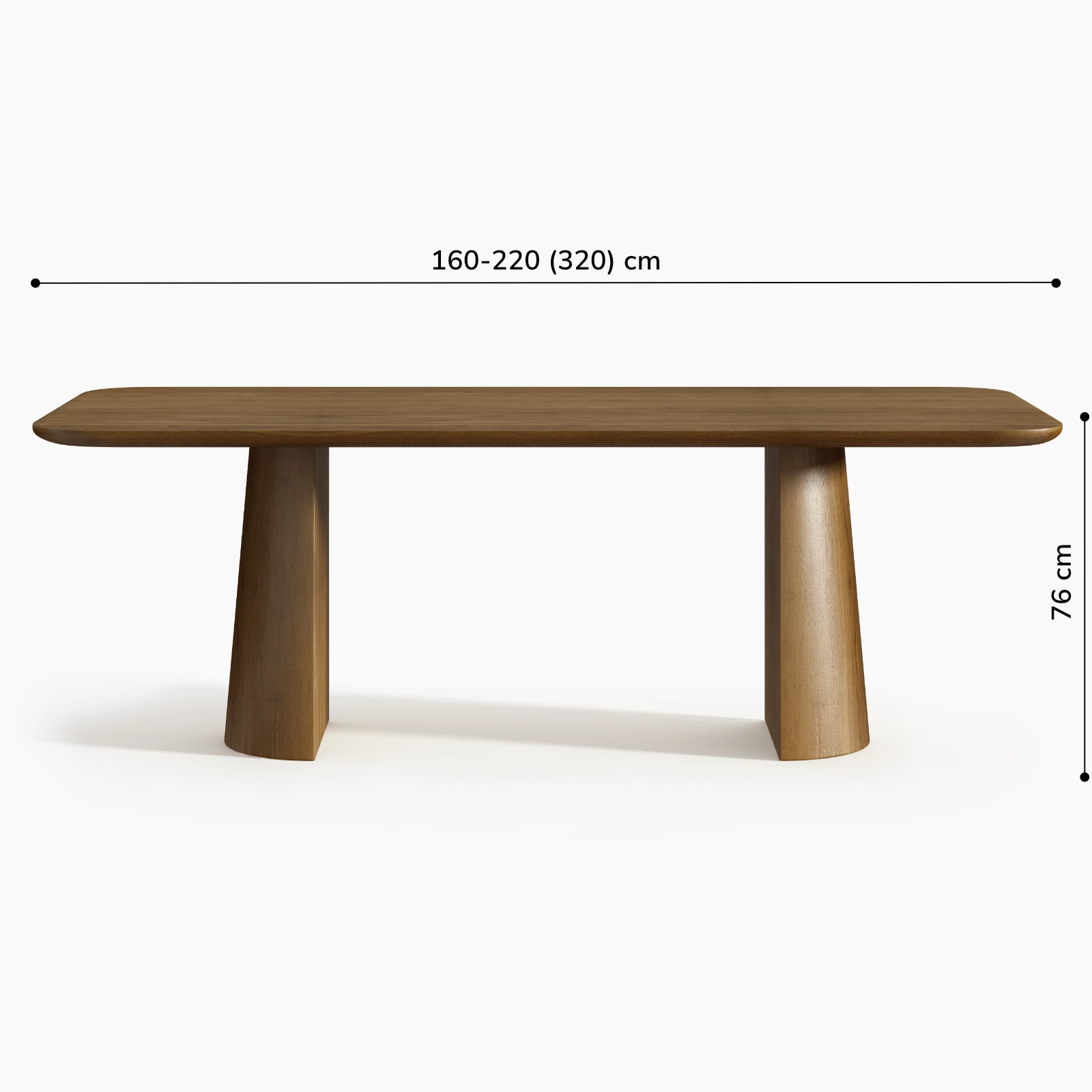 Podobnie jak w modelu Colosso, Augusto umożliwia rozbudowę blatu za pomocą systemu dębowych dostawek. Rozwiązanie to zostało zaprojektowane tak, aby zachować spójność formy i proporcji niezależnie od konfiguracji. Konstrukcja z litego drewna została wykończona naturalnym fornirem dębowym, co pozwala na kontrolę rysunku powierzchni przy zachowaniu trwałości materiałowej.