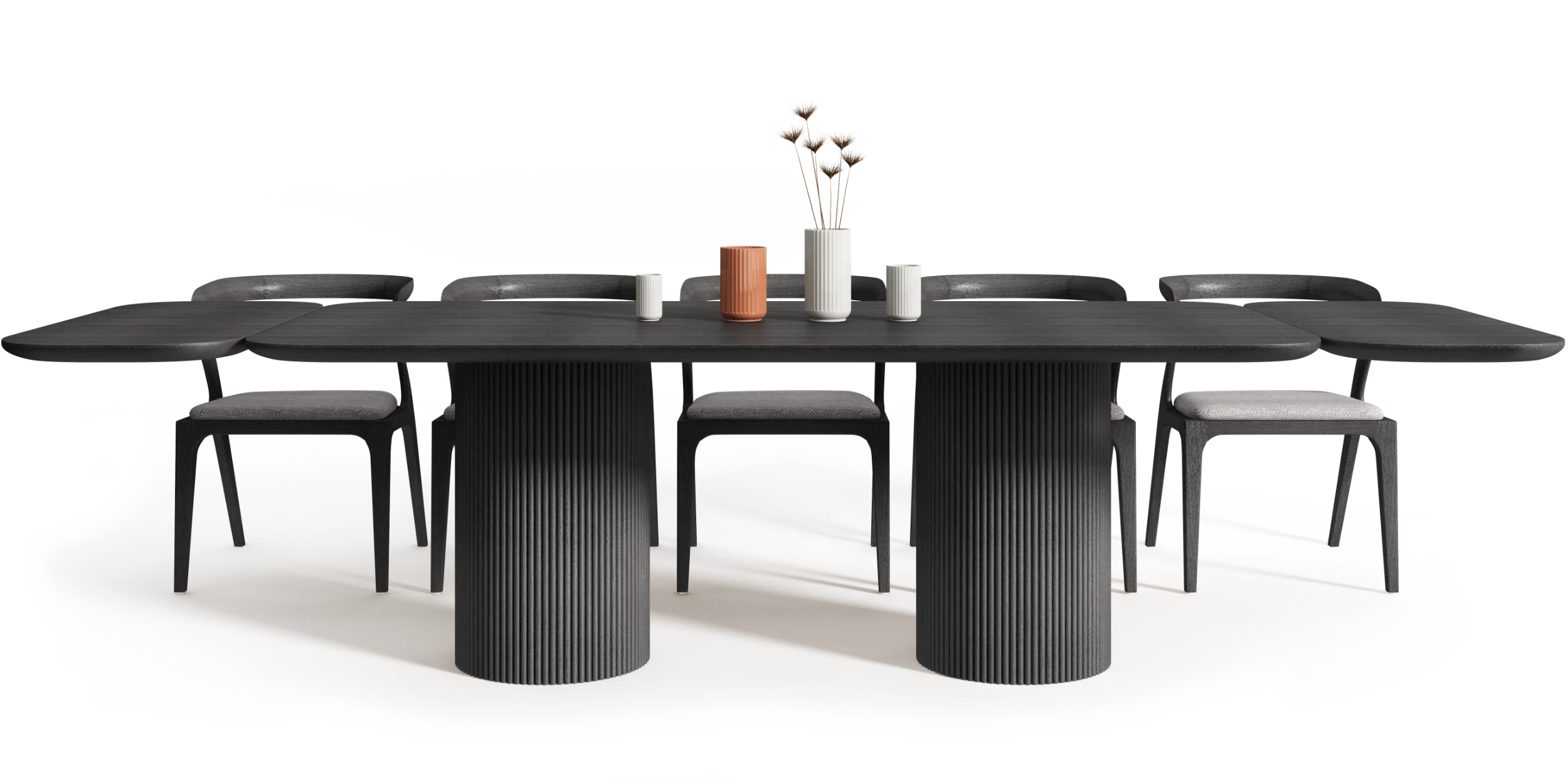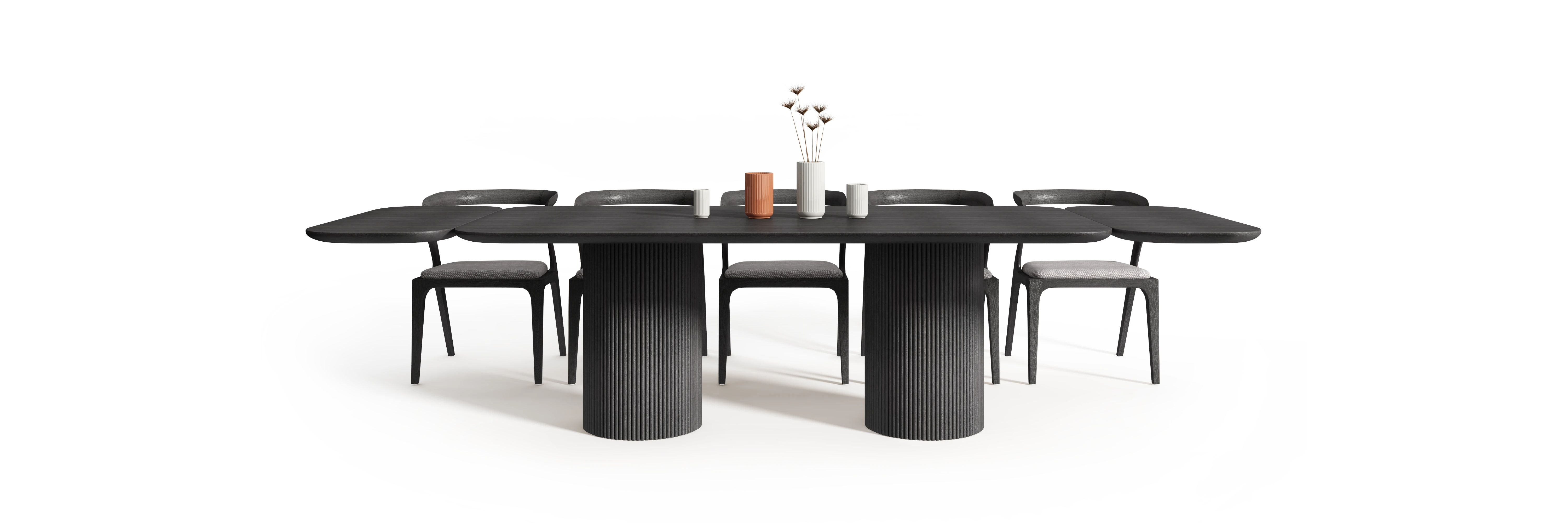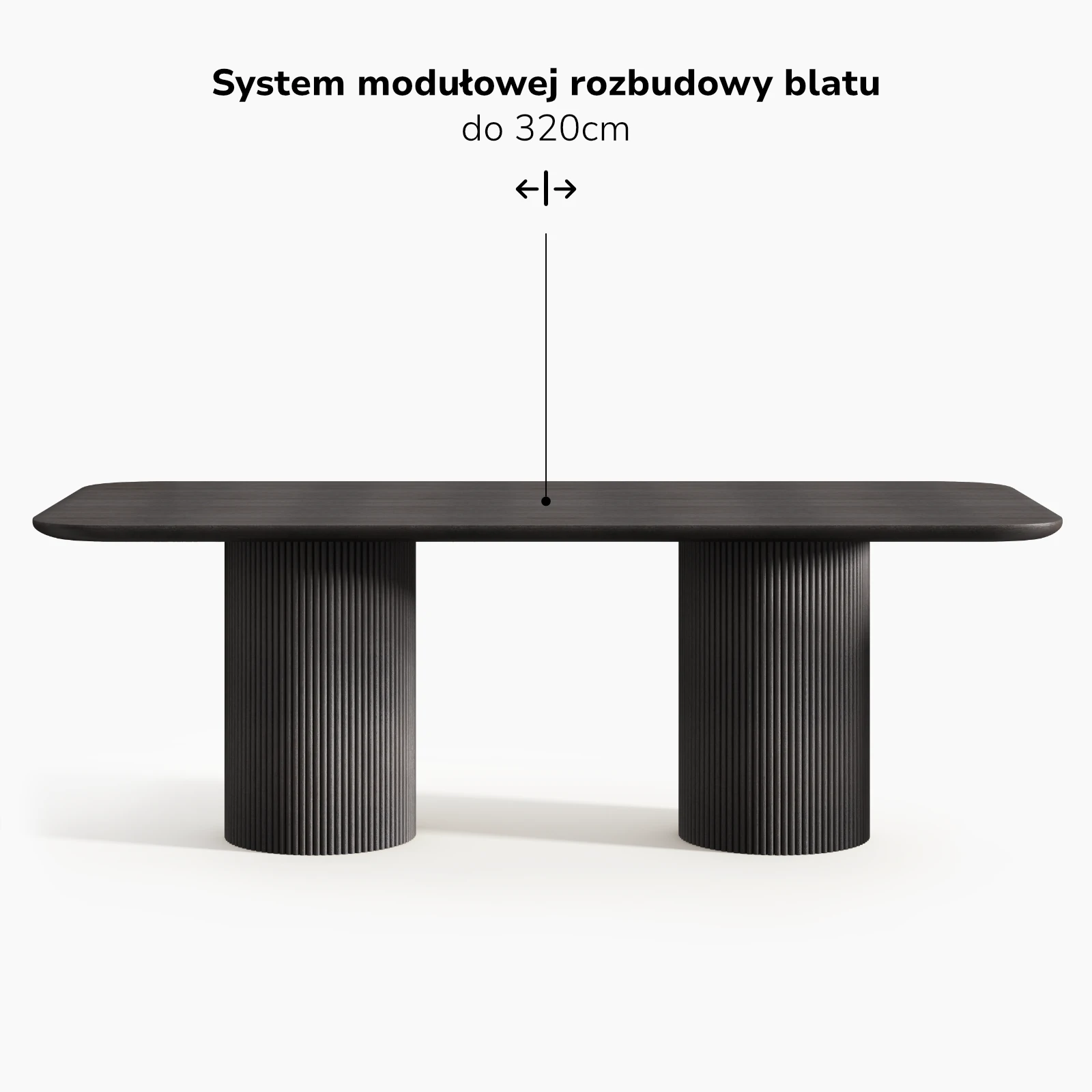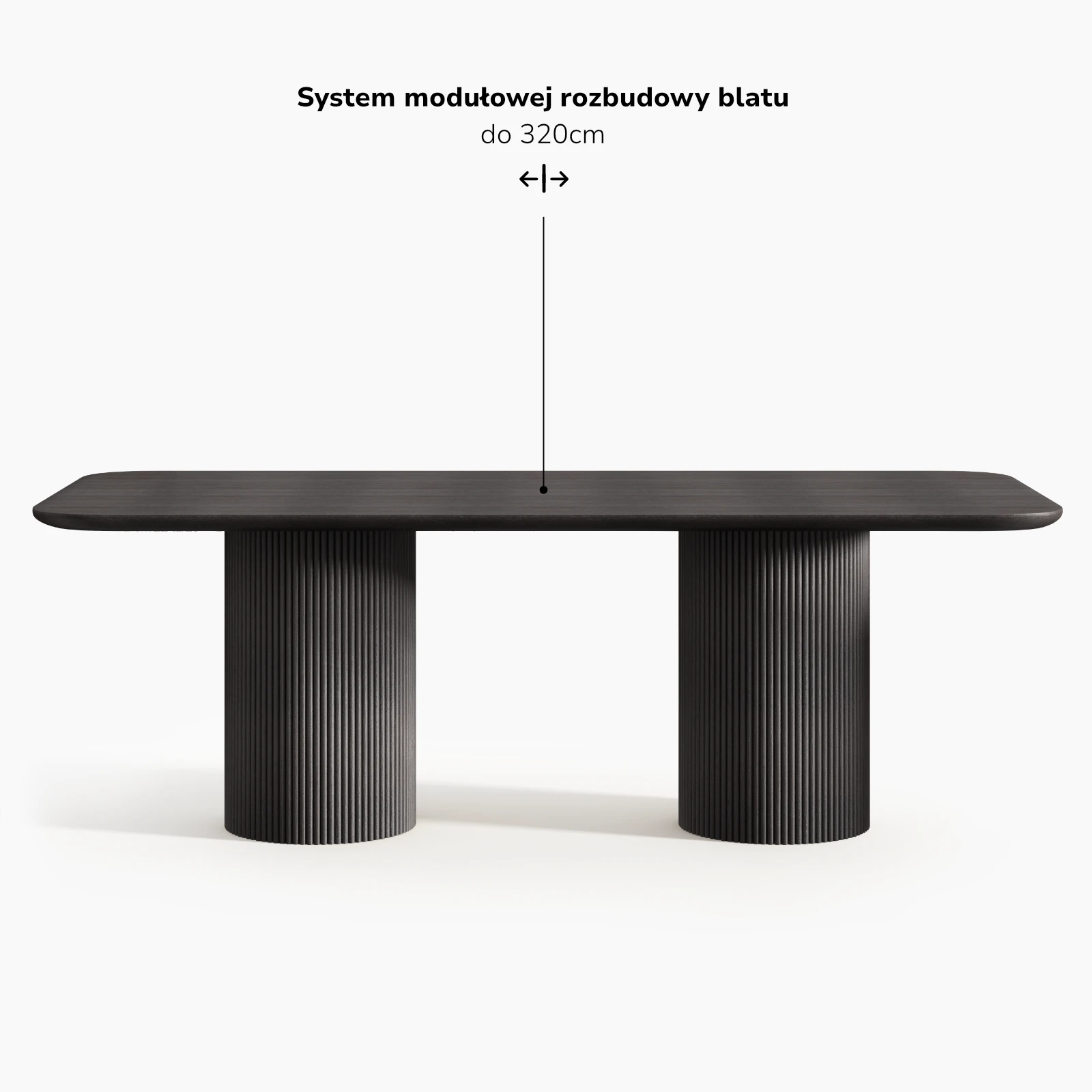 Stół został zaprojektowany z myślą o możliwości modułowej rozbudowy. Zastosowanie spójnych stylistycznie dostawek pozwala na zwiększenie długości blatu przy zachowaniu jednolitej proporcji i czytelnej relacji pomiędzy wszystkimi elementami konstrukcji.