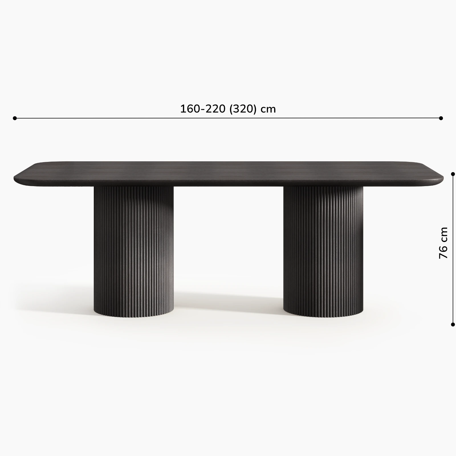 Cylindryczne podstawy z litego drewna stanowią stabilny punkt kompozycji. Pionowy rytm dębowych lameli porządkuje ich obwód i nadaje bryle klarowną strukturę. Lekki wizualnie blat z drewna dębowego został zaprojektowany z niestandardowym przekrojem krawędzi, prowadzonym po linii łuku. Zabieg ten redukuje optyczny ciężar i równoważy masywność elementów nośnych.
