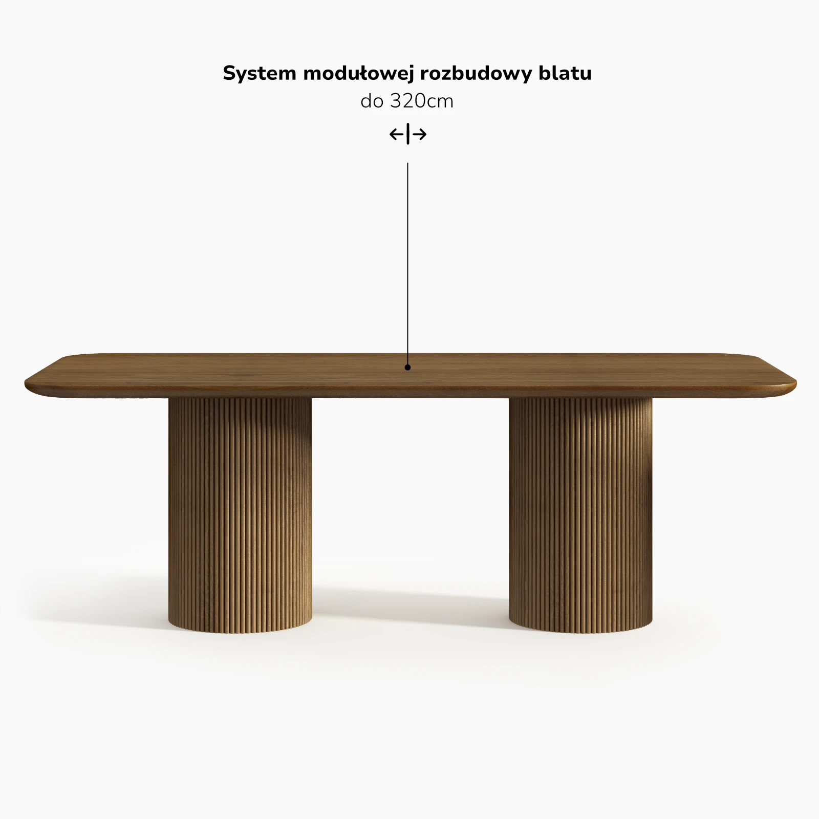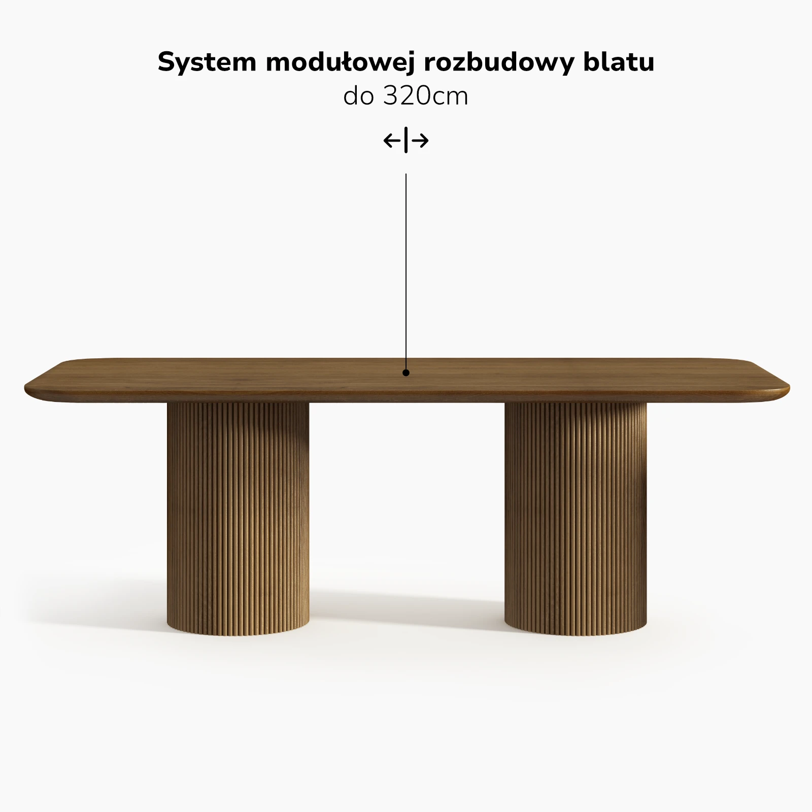 Stół został zaprojektowany z myślą o możliwości modułowej rozbudowy. Zastosowanie spójnych stylistycznie dostawek pozwala na zwiększenie długości blatu przy zachowaniu jednolitej proporcji i czytelnej relacji pomiędzy wszystkimi elementami konstrukcji.