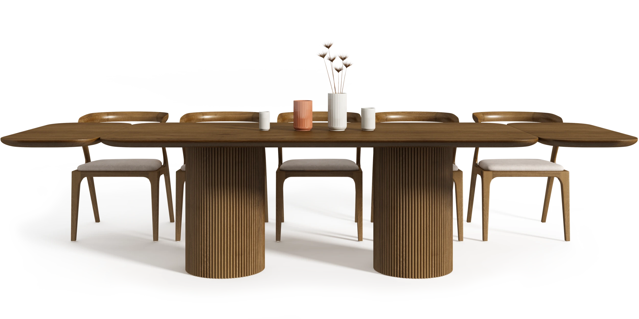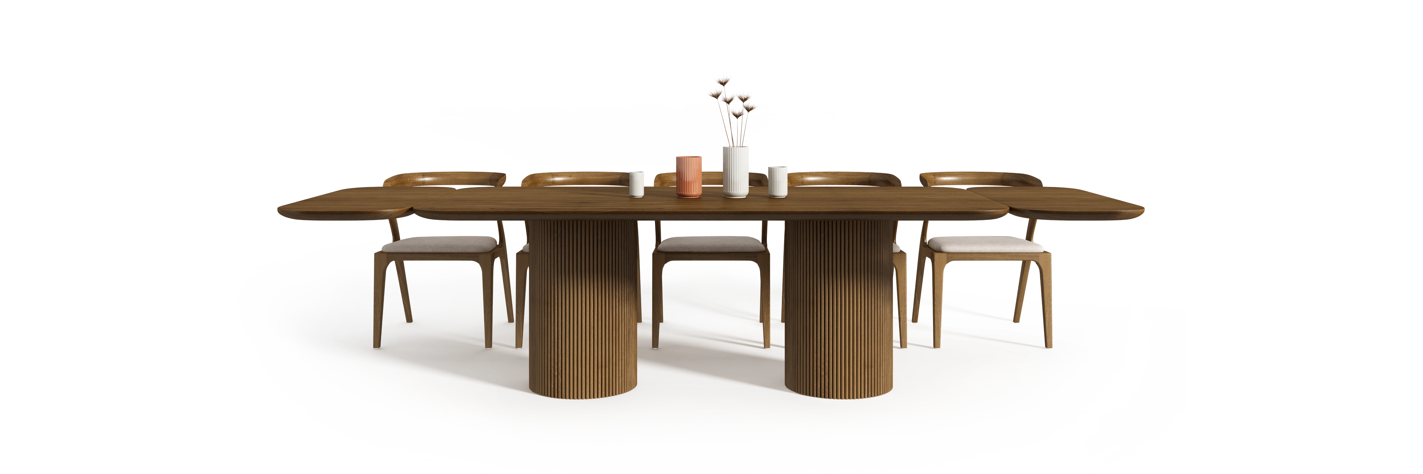 Cylindryczne podstawy z litego drewna stanowią stabilny punkt kompozycji. Pionowy rytm dębowych lameli porządkuje ich obwód i nadaje bryle klarowną strukturę. Lekki wizualnie blat z drewna dębowego został zaprojektowany z niestandardowym przekrojem krawędzi, prowadzonym po linii łuku. Zabieg ten redukuje optyczny ciężar i równoważy masywność elementów nośnych.