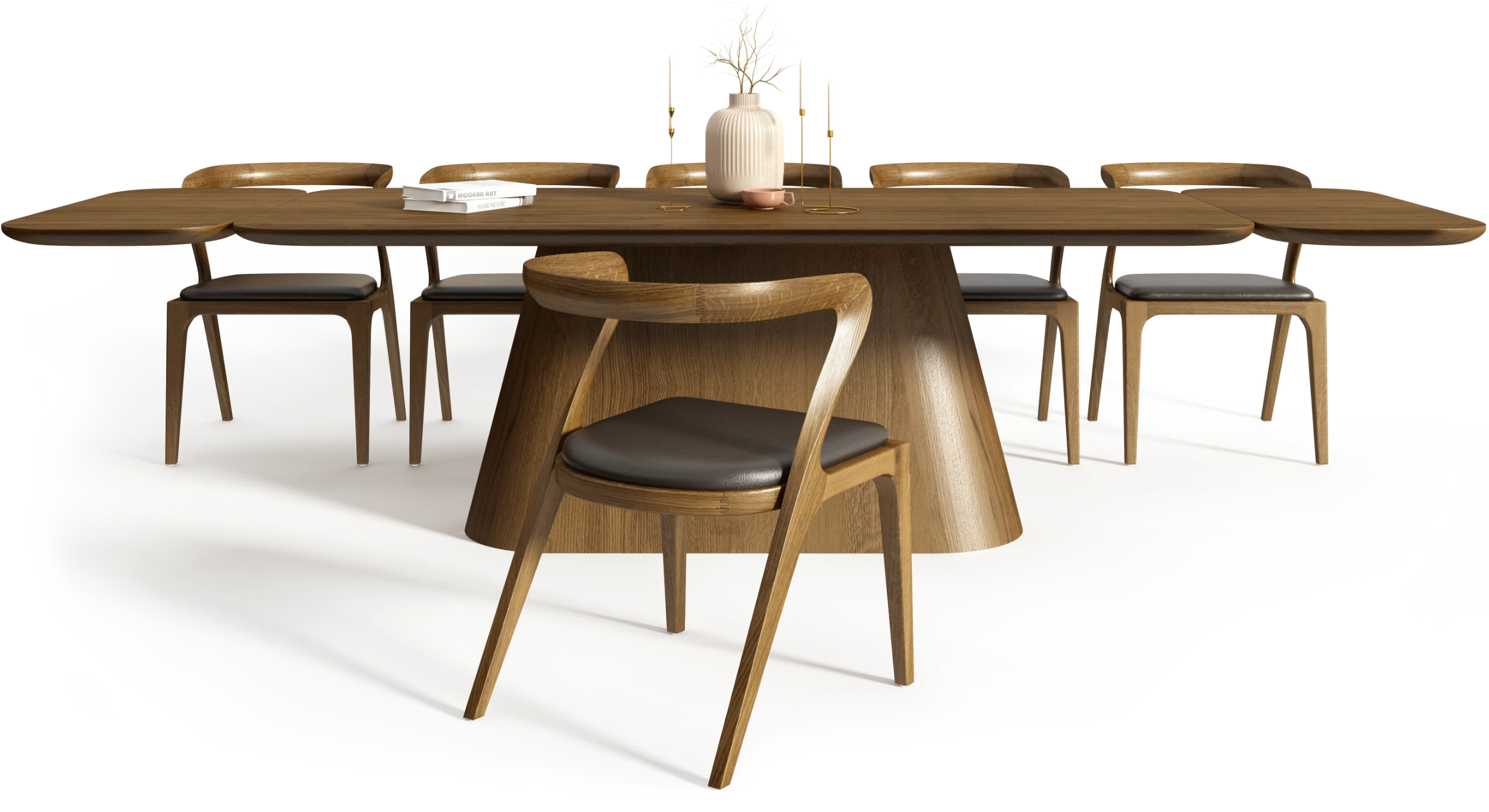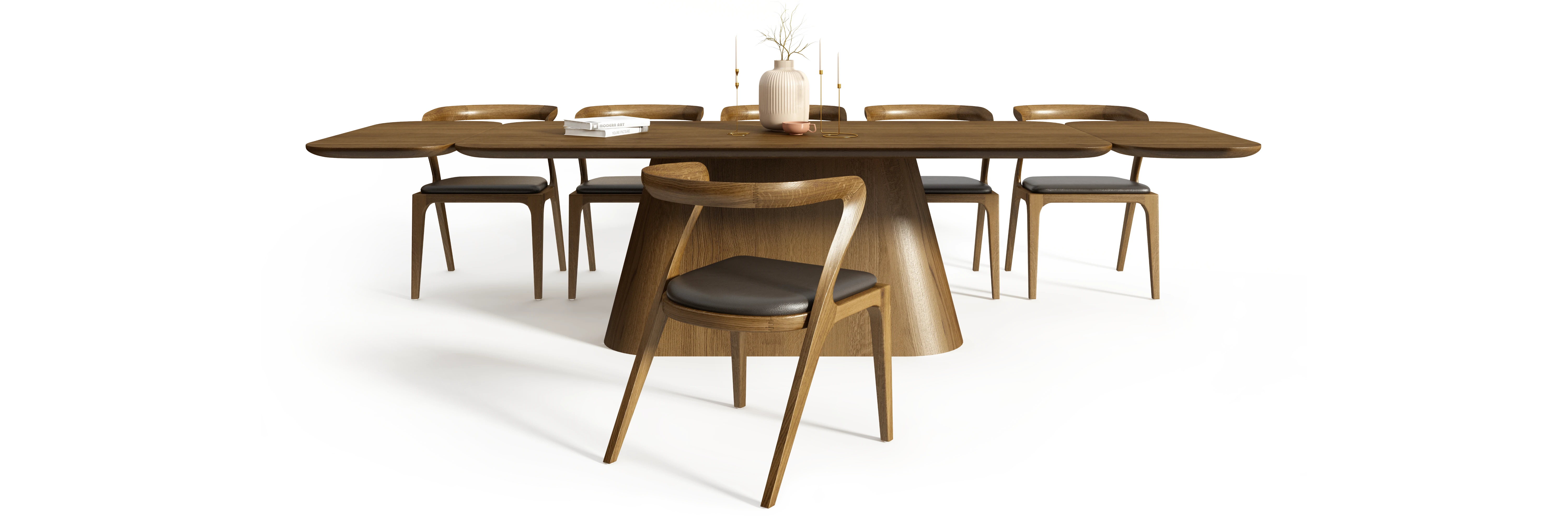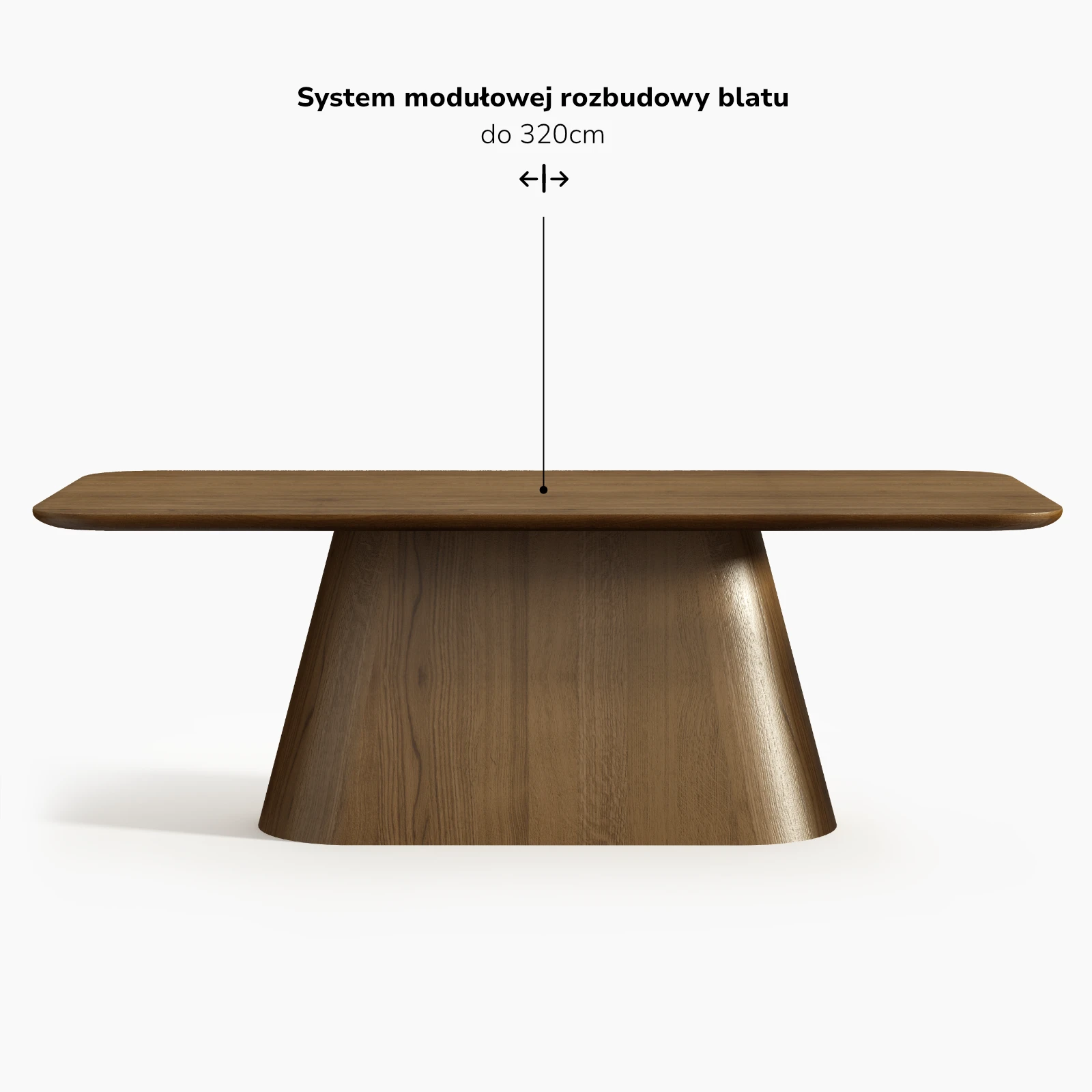 Magnifico korzysta z systemu modułowej rozbudowy opartego na dębowych dostawkach. Rozwiązanie to zostało zintegrowane z konstrukcją w sposób, który nie narusza pierwotnych proporcji stołu. Zmiana skali nie prowadzi do zmiany charakteru obiektu, a techniczne elementy pozostają podporządkowane całościowej logice formy.