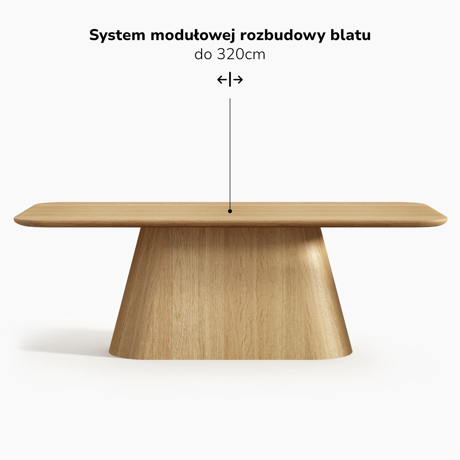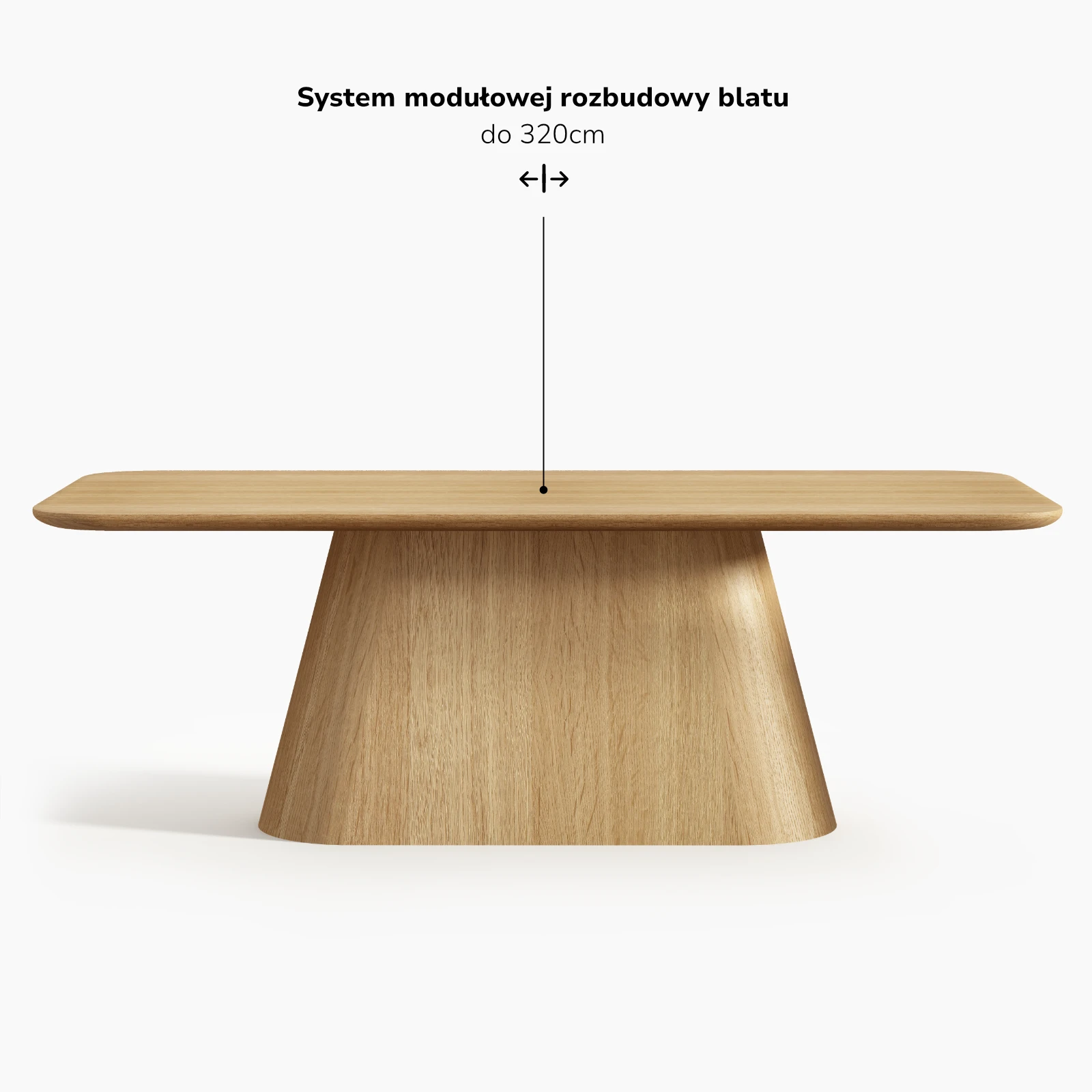 Magnifico korzysta z systemu modułowej rozbudowy opartego na dębowych dostawkach. Rozwiązanie to zostało zintegrowane z konstrukcją w sposób, który nie narusza pierwotnych proporcji stołu. Zmiana skali nie prowadzi do zmiany charakteru obiektu, a techniczne elementy pozostają podporządkowane całościowej logice formy.