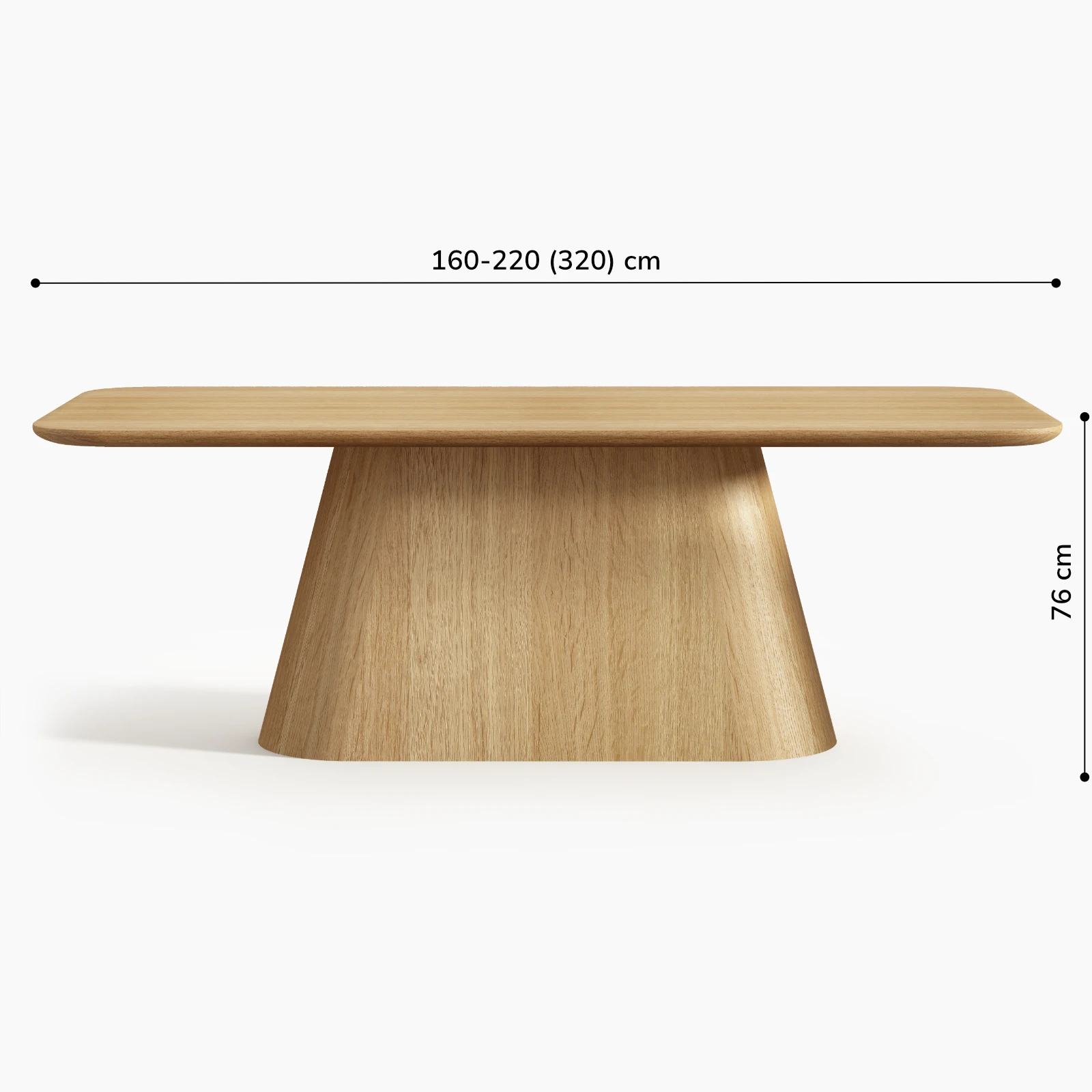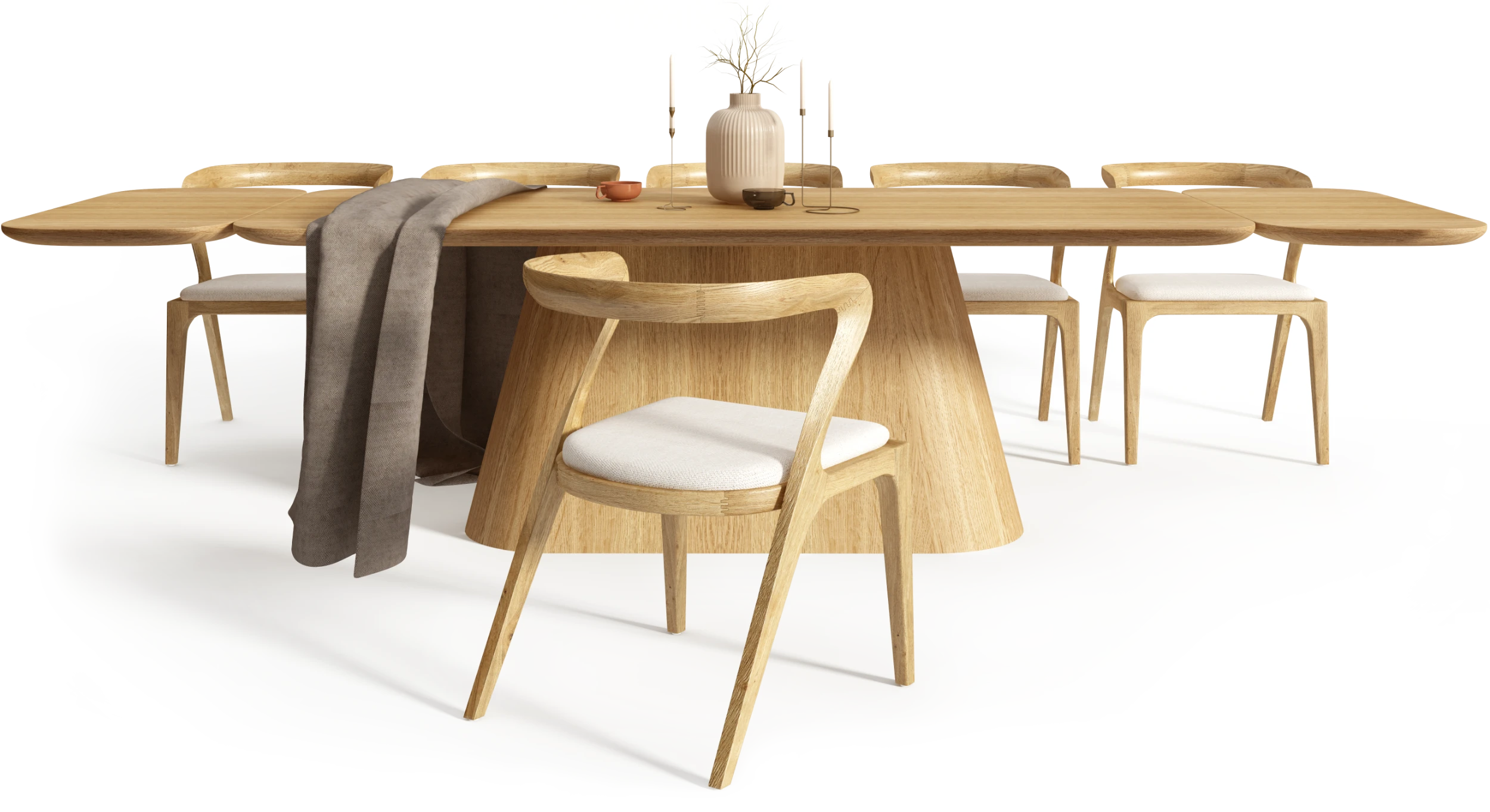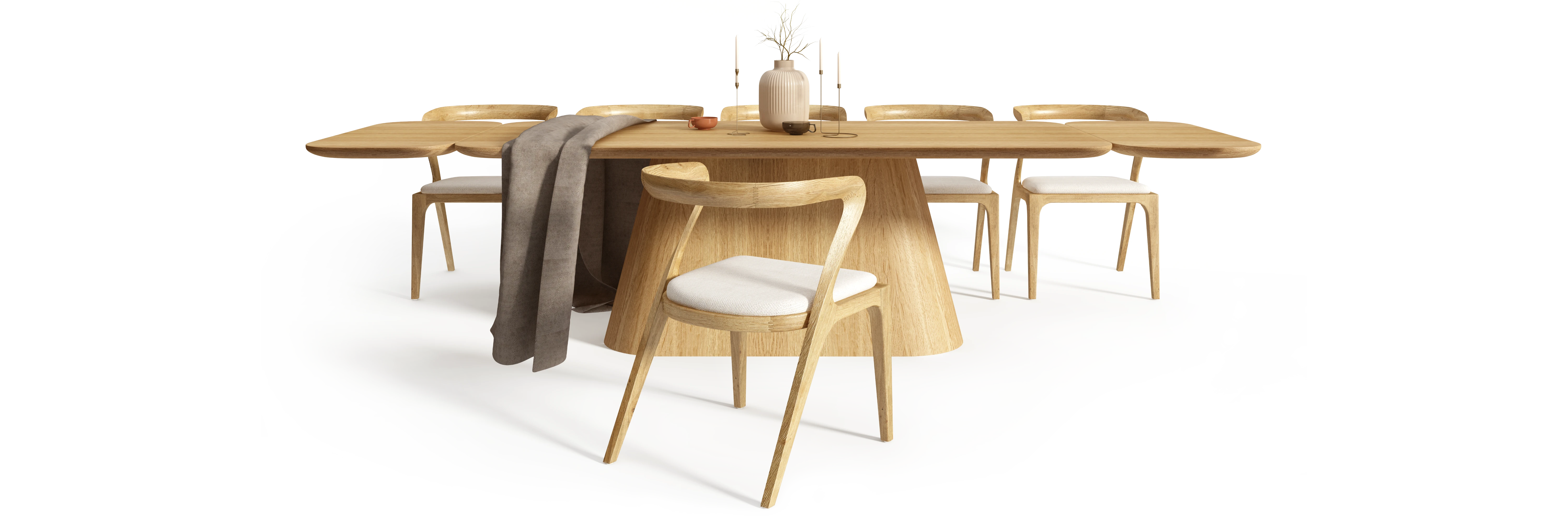 Projekt Magnifico opiera się na analizie podstawowych elementów stołu jako obiektu użytkowego. Blat zaprojektowano jako jednorodną płaszczyznę o czytelnych proporcjach, z zaokrąglonymi narożnikami wynikającymi z ergonomii użytkowania. Przekrój krawędzi poprowadzono po łuku, co pozwala złagodzić geometrię bez wprowadzania dekoracyjności. Podstawa została świadomie zredukowana i pozbawiona akcentów dekorujących. Jej skala i bryła wynikają z relacji z blatem, a nie z potrzeby formalnego kontrapunktu. Wykonanie z litego drewna, uszlachetnionego fornirem dębowym, pozwala zachować jednorodność układu usłojenia i kontrolować odbiór powierzchni przy zachowaniu konstrukcyjnej stabilności.