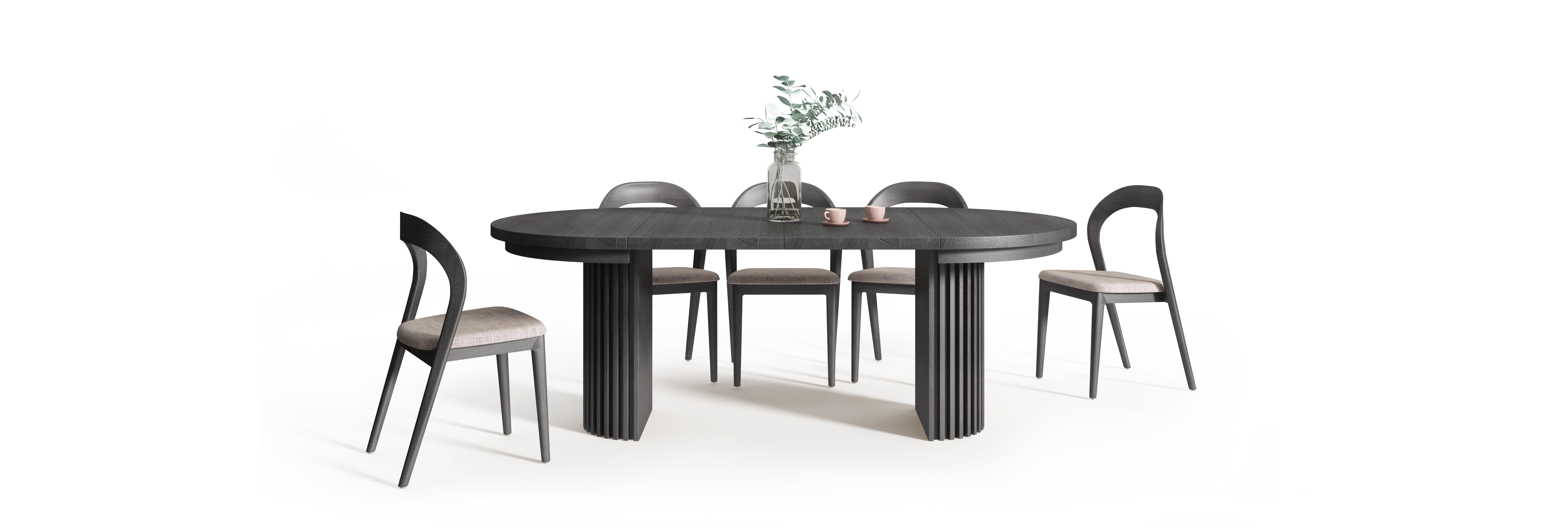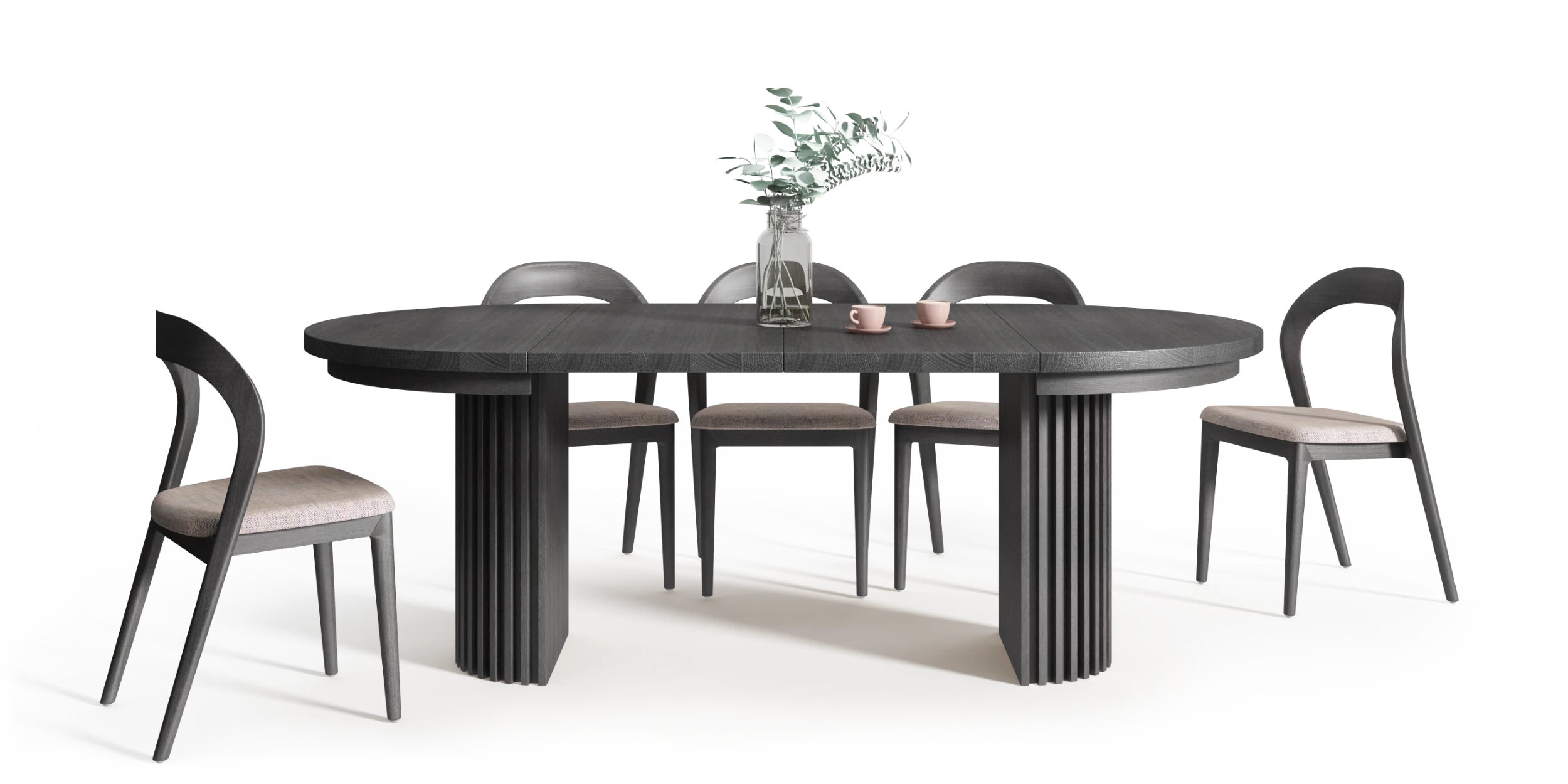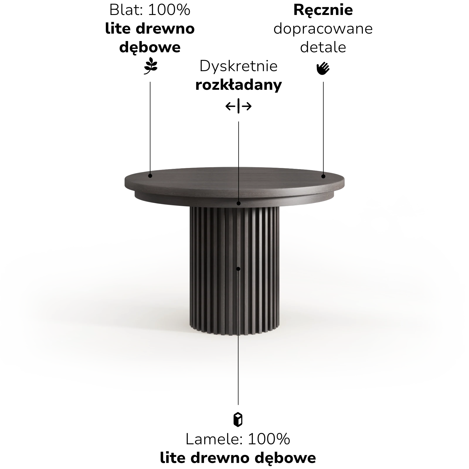 Centralna podstawa wykonana z drewna litego, inspirowana klasyczną kolumną, zapewnia wygodę użytkowania z każdej strony, a rytmiczne lamele dębowe łagodnie modelują światło i nadają konstrukcji lekkości. To stół, który harmonijnie łączy potrzebę bliskości z gotowością na większe spotkania.