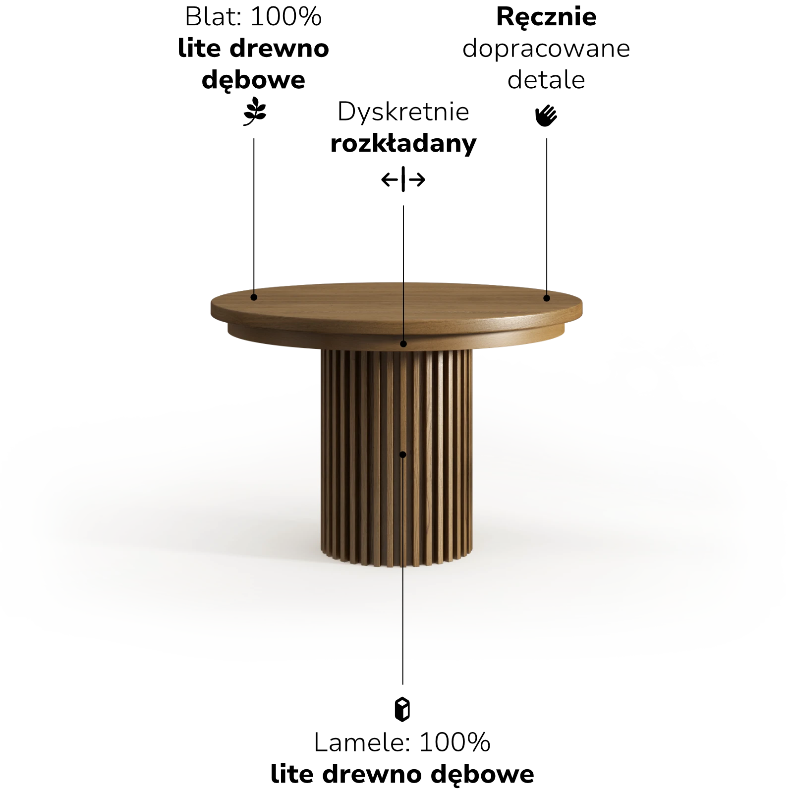 Centralna podstawa wykonana z drewna litego, inspirowana klasyczną kolumną, zapewnia wygodę użytkowania z każdej strony,