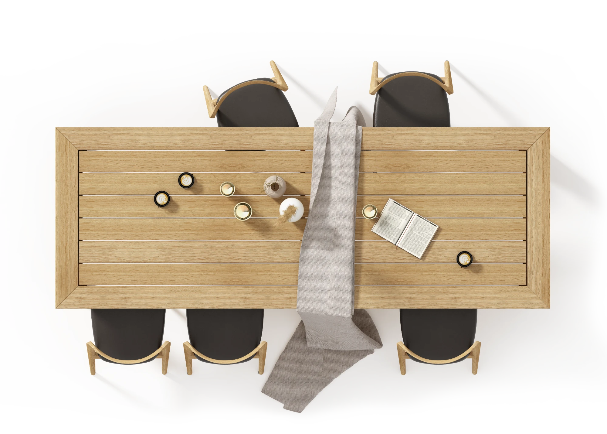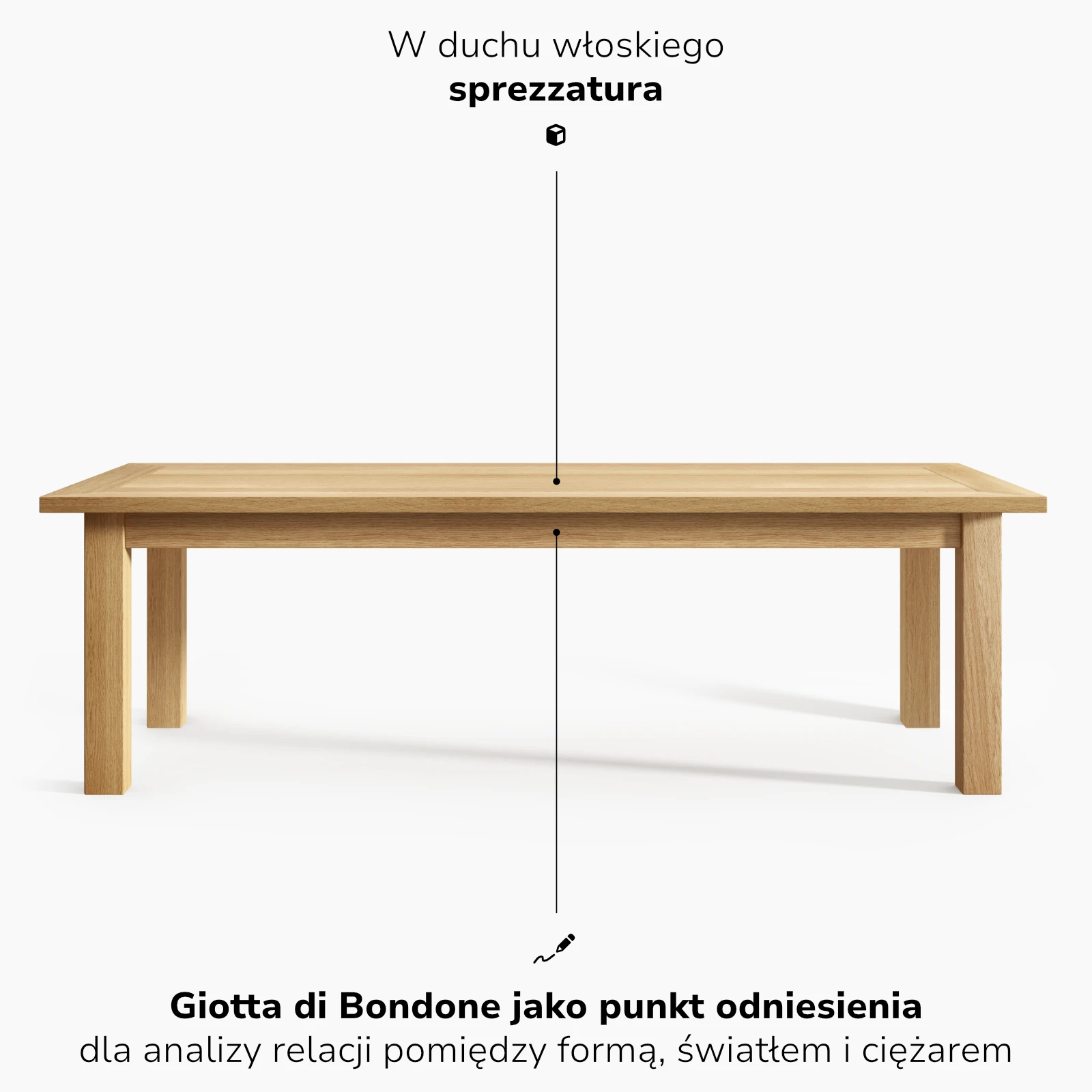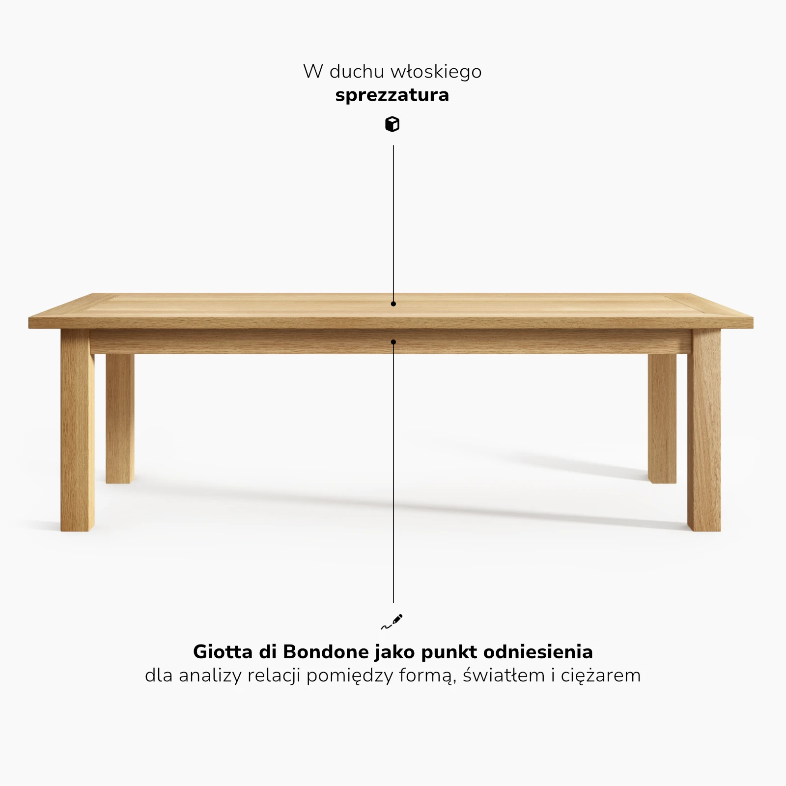 Projekt stołu Giotto został oparty na analogicznym sposobie myślenia o formie użytkowej. Punkt wyjścia stanowiła analiza relacji pomiędzy płaszczyzną blatu a strukturą nośną. Decyzje formalne wynikają z kontroli proporcji, grubości materiału i sposobu przenoszenia ciężaru, a nie z potrzeby akcentowania detalu.
