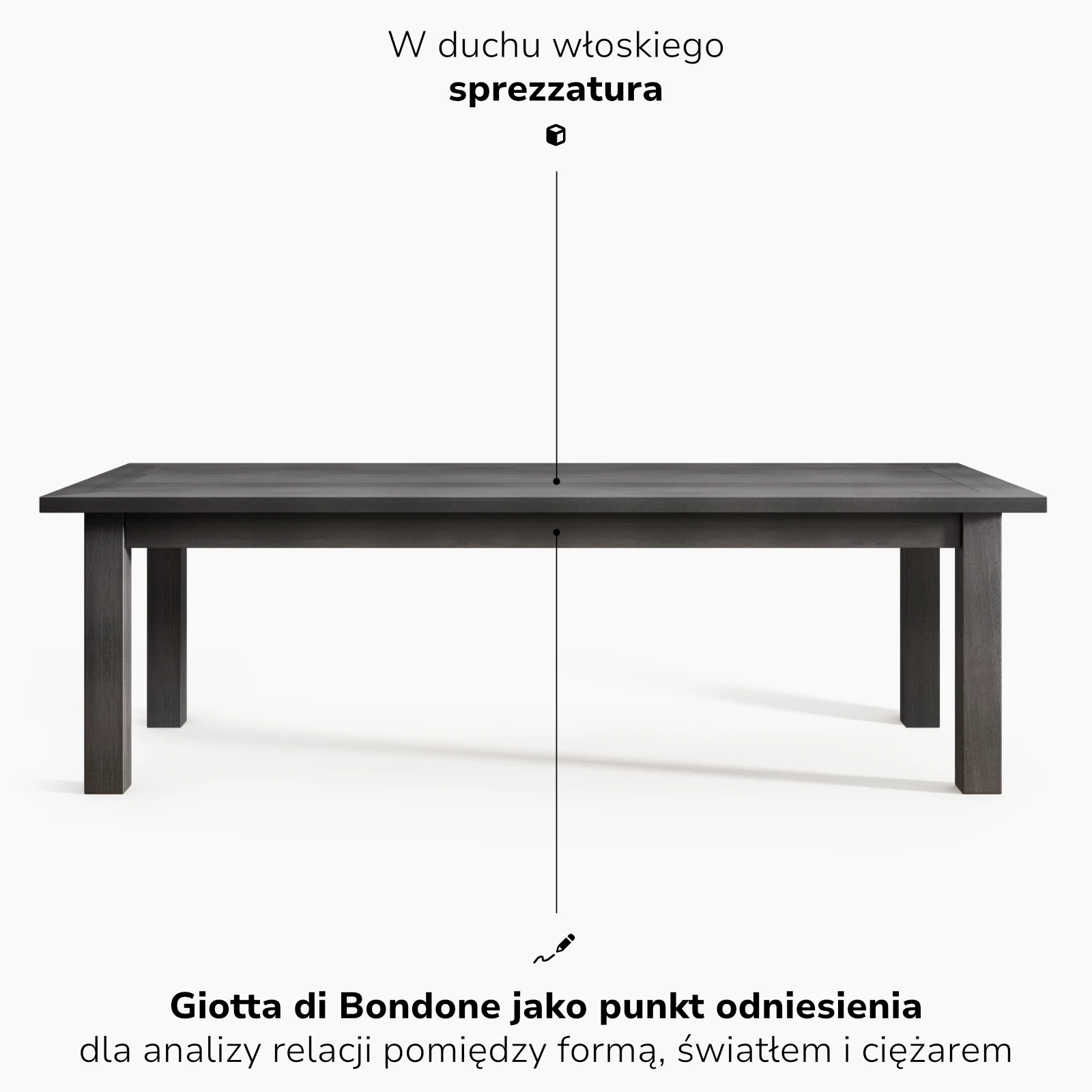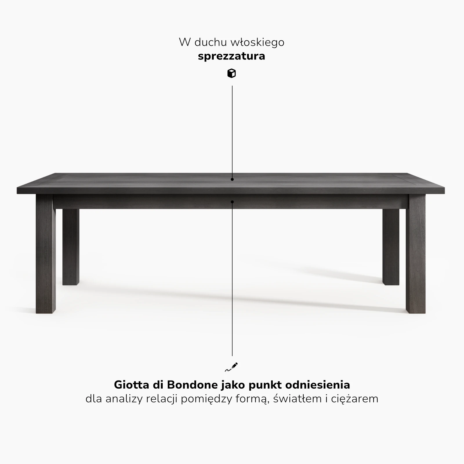 Projekt stołu Giotto został oparty na analogicznym sposobie myślenia o formie użytkowej. Punkt wyjścia stanowiła analiza relacji pomiędzy płaszczyzną blatu a strukturą nośną. Decyzje formalne wynikają z kontroli proporcji, grubości materiału i sposobu przenoszenia ciężaru, a nie z potrzeby akcentowania detalu.