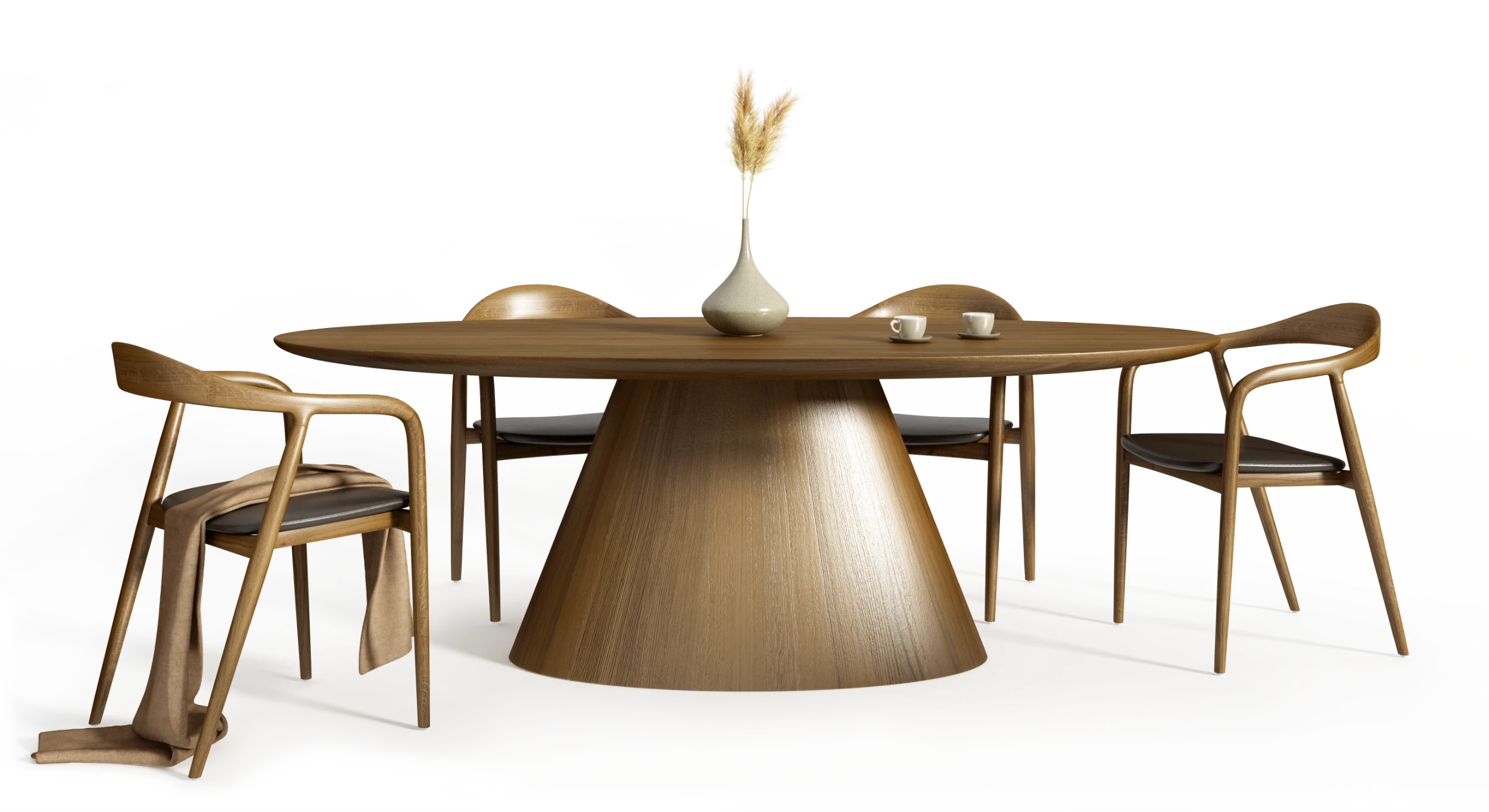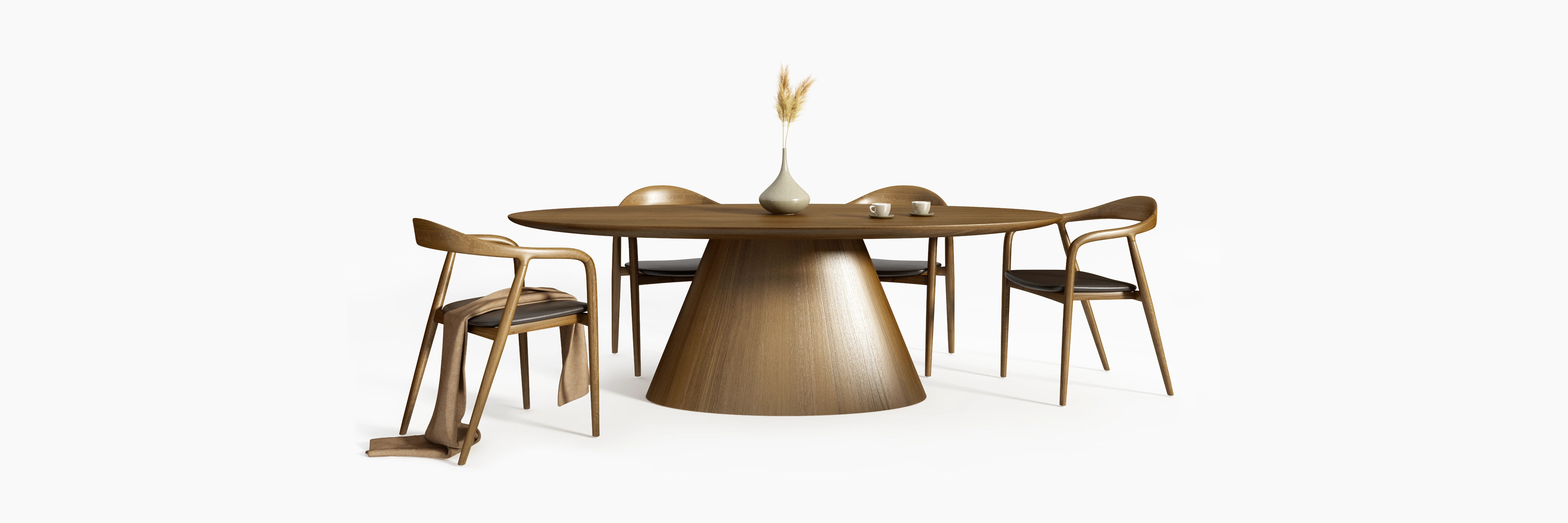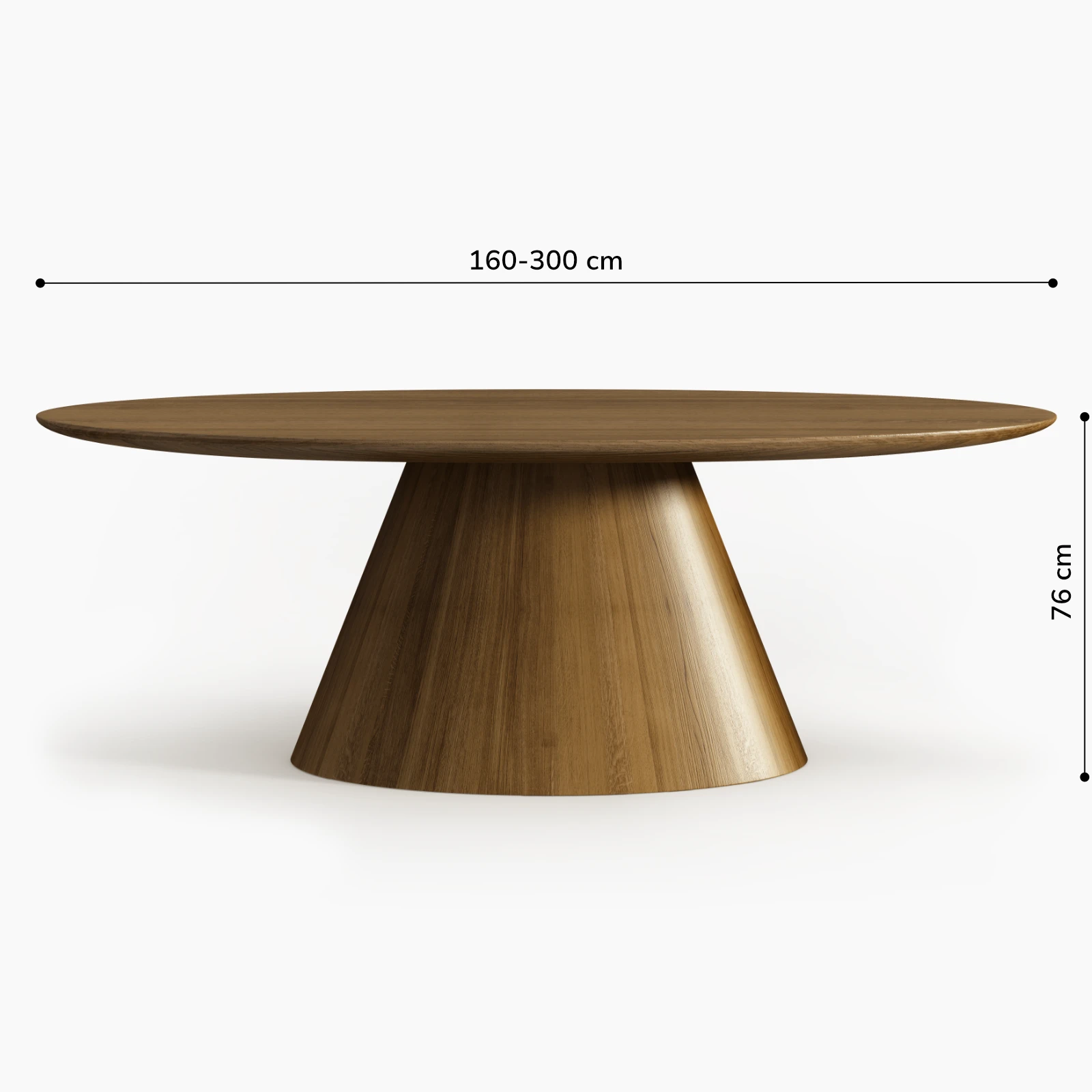 Elipsoidalny blat z litego dębu o grubości 6 cm został osadzony na zwężającej się ku górze podstawie, której przekrój porządkuje relację stabilności i wizualnej lekkości. Zmiana szerokości podstawy nie pełni funkcji estetycznej, lecz wynika z analizy obciążeń i rytmu formy.