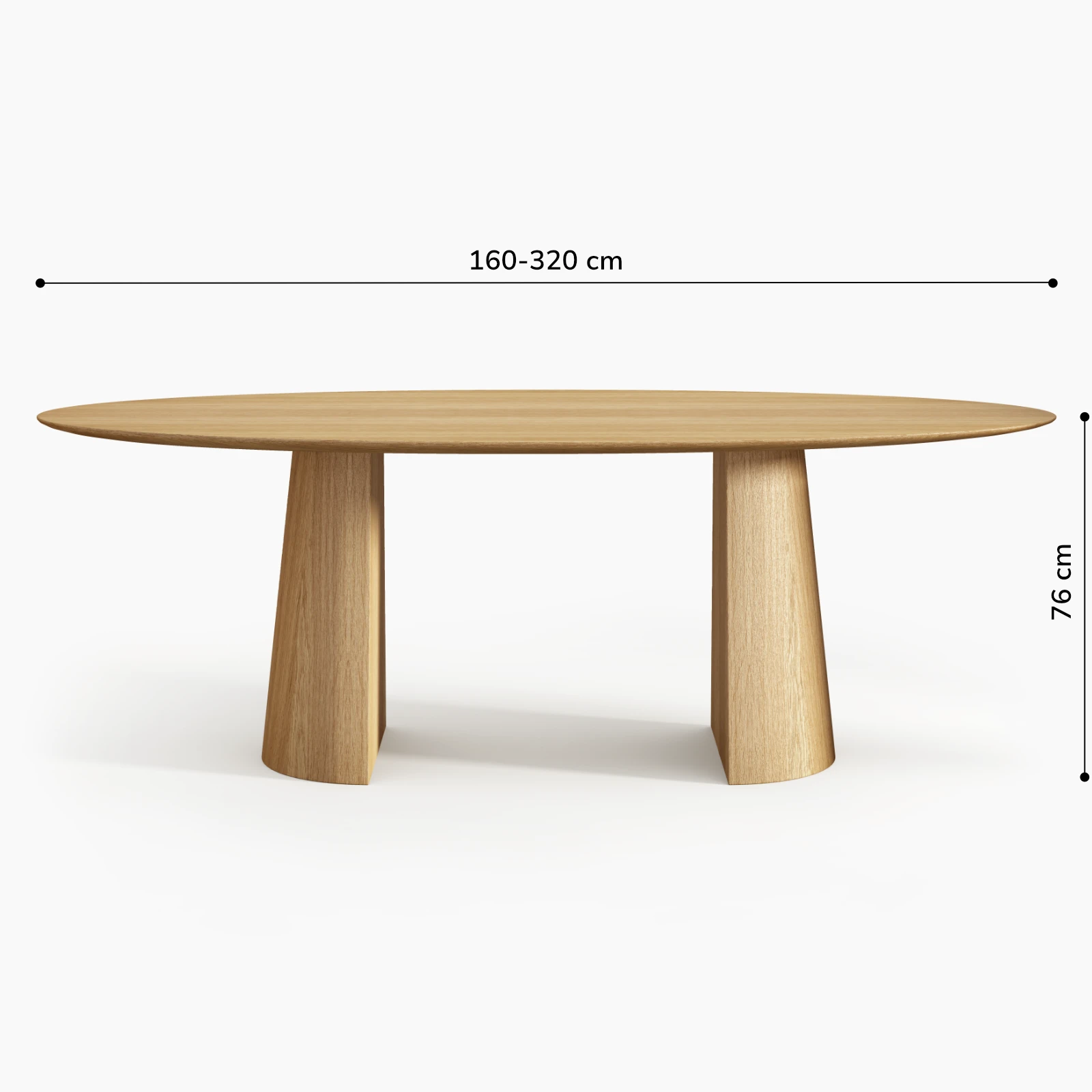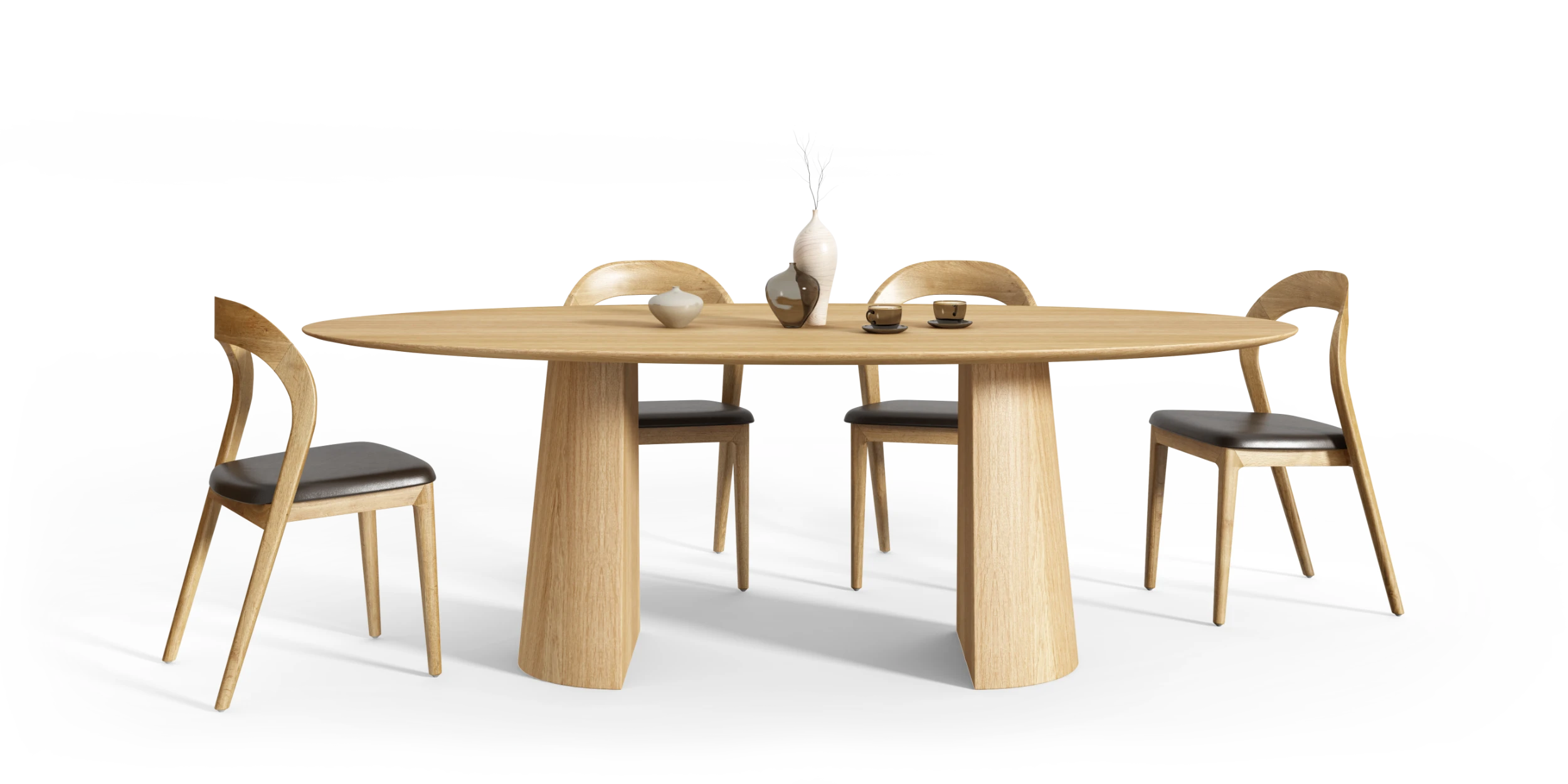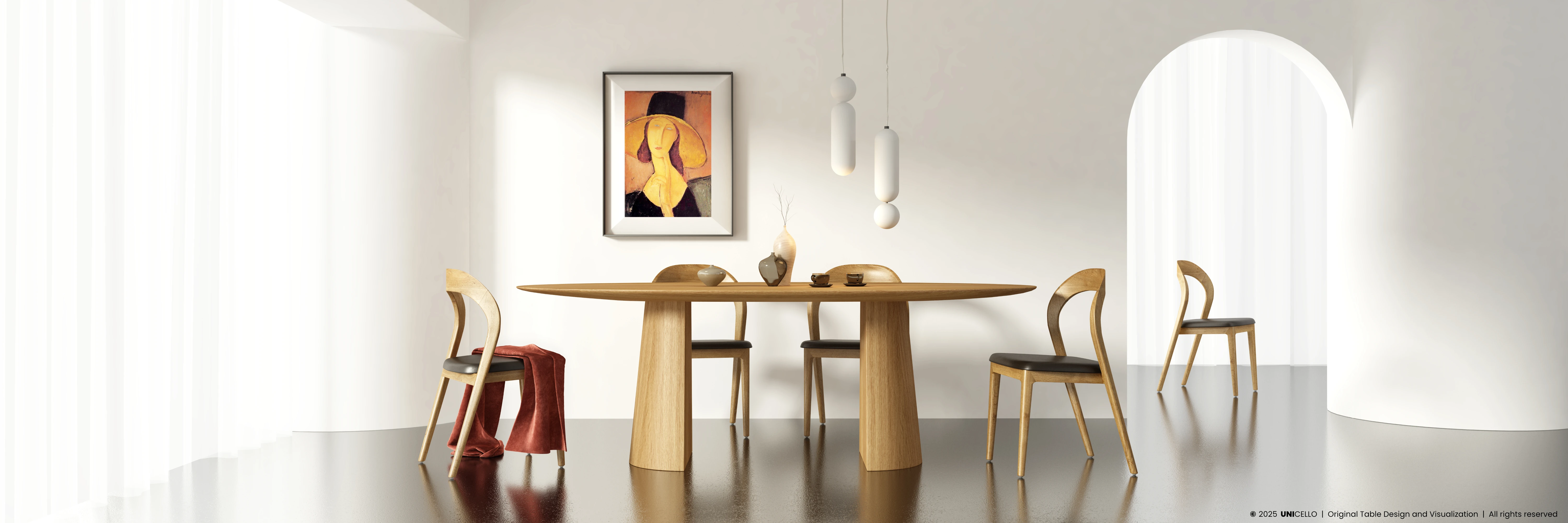 Eliptyczny blat stołu operuje podobnym zabiegiem projektowym. Jego kształt i podcięcie odbierają masie jednoznaczność. Ciężar przestaje być oczywisty, a forma zyskuje charakter bardziej relacyjny niż materialny.