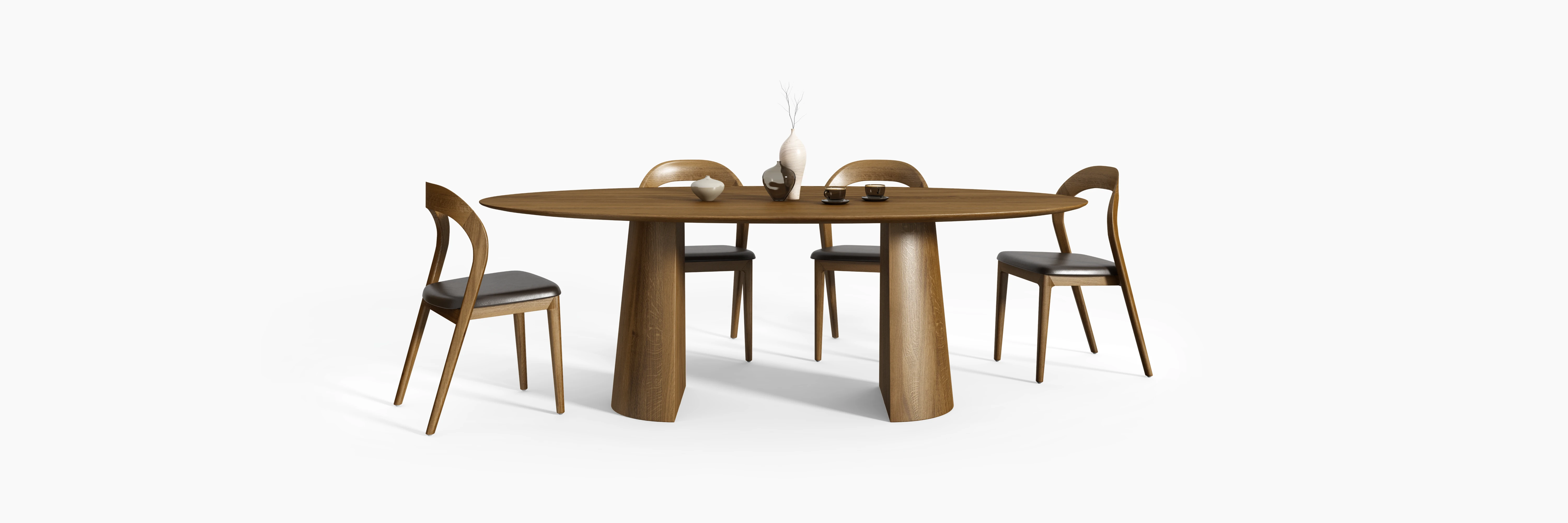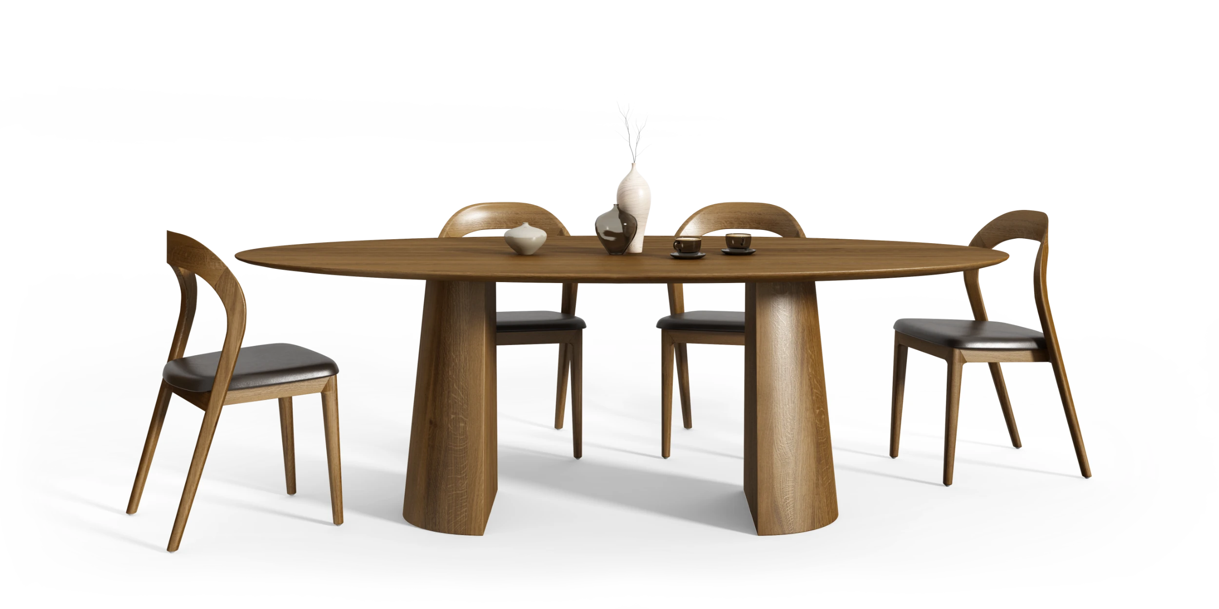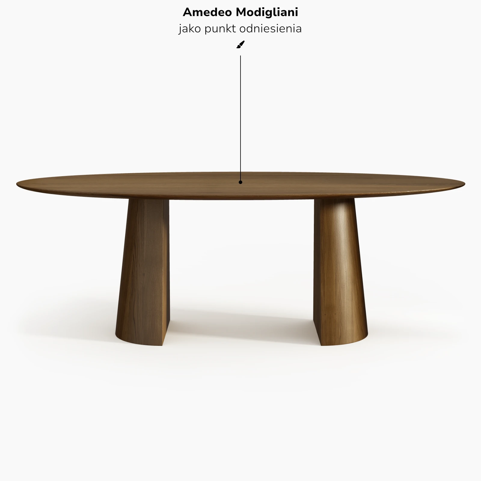 Eliptyczny blat stołu operuje podobnym zabiegiem projektowym. Jego kształt i podcięcie odbierają masie jednoznaczność. Ciężar przestaje być oczywisty, a forma zyskuje charakter bardziej relacyjny niż materialny. Podstawa złożona z dwóch półkolistych elementów nie wprowadza narracji figuralnej. Jej sens wynika z proporcji i rytmu. Podobnie jak u Modiglianiego, uproszczenie nie prowadzi do schematu, lecz do koncentracji znaczeń. Tło portretów Modiglianiego pozostaje wyciszone i podporządkowane postaci. W Corrente Duo materiał i usłojenie pełnią analogiczną funkcję. Nie dominują formy, lecz ją stabilizują i porządkują.