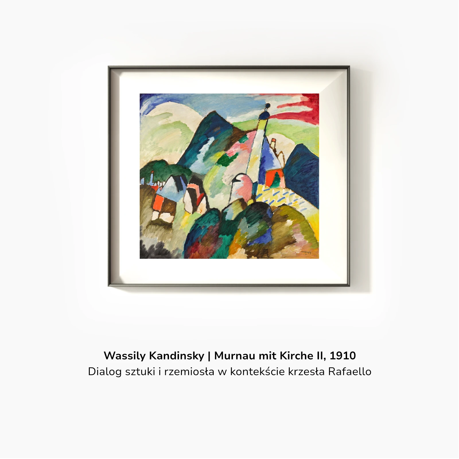 W obrazie Murnau mit Kirche II Kandinsky porządkuje przestrzeń poprzez relacje barwnych pól i linii, rezygnując z opisowości na rzecz napięcia kompozycyjnego. Forma nie służy przedstawieniu, lecz organizuje percepcję poprzez rytm, kontrast i kierunek.