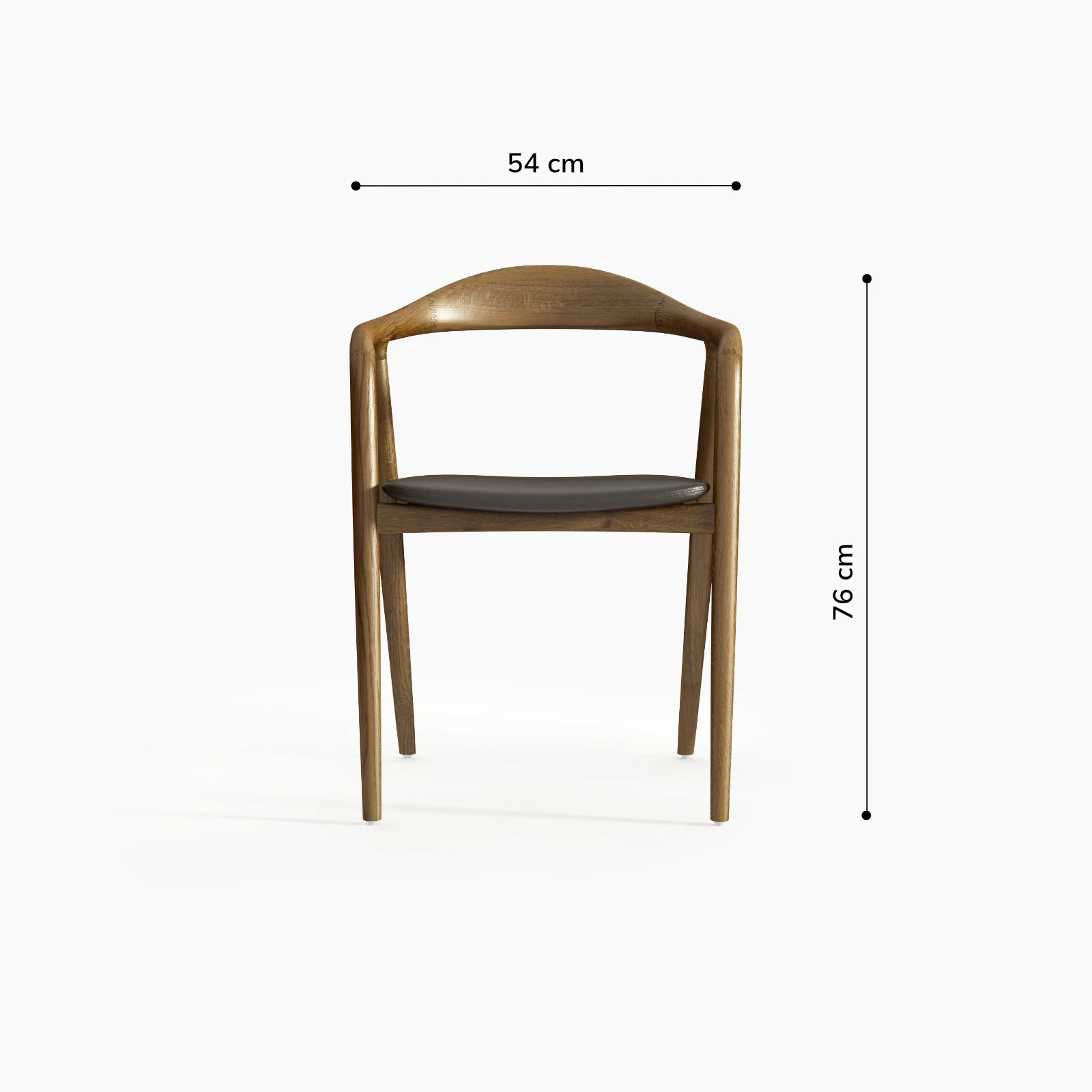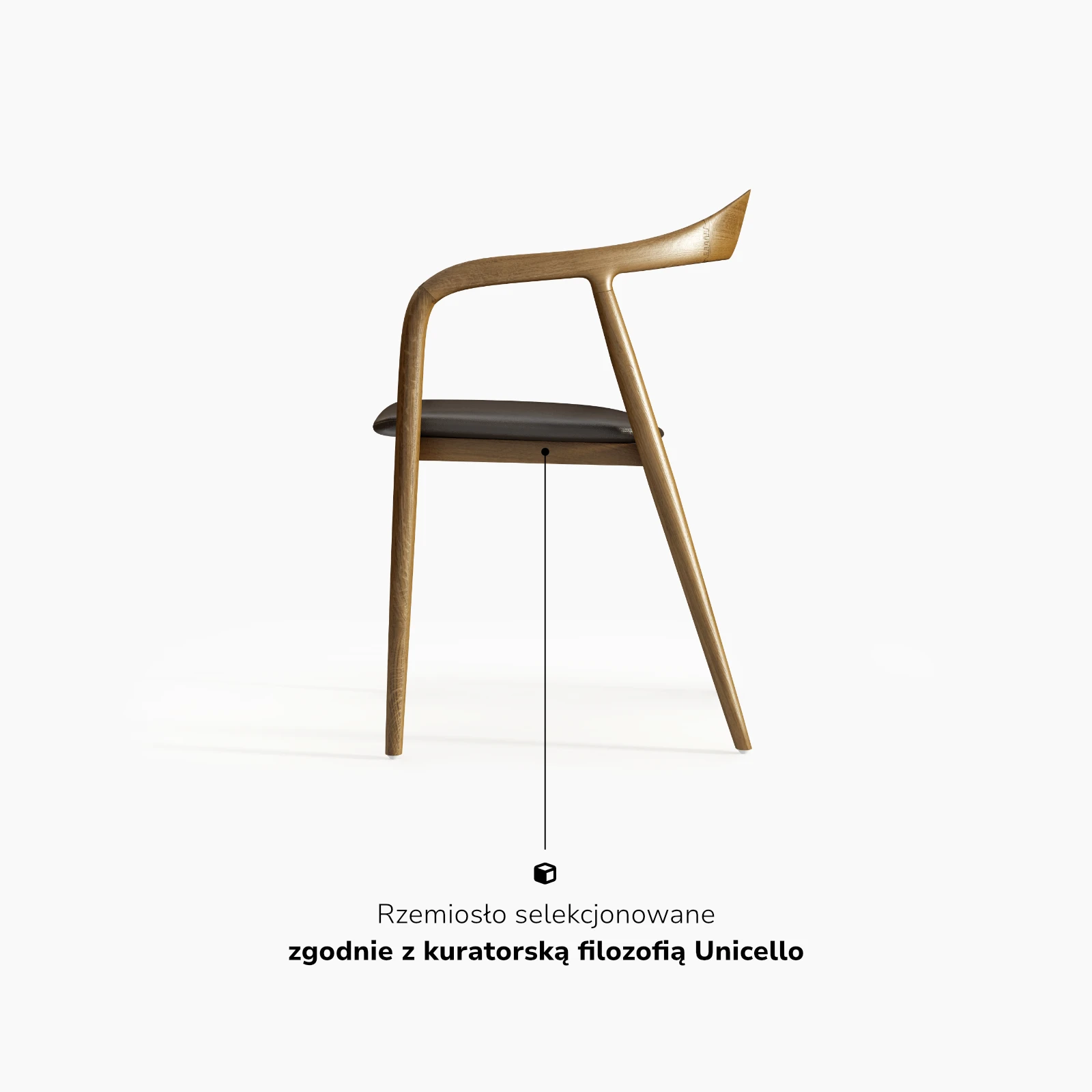 Krzesło wykonane w całości z litego drewna jesionowego, wybranego ze względu na przewidywalność pracy materiału w przekroju oraz stabilność strukturalną przy smukłych proporcjach elementów. Konstrukcja opiera się na czytelnych relacjach pomiędzy siedziskiem, oparciem i układem nóg, bez stosowania zabiegów formalnych wykraczających poza logikę struktury.